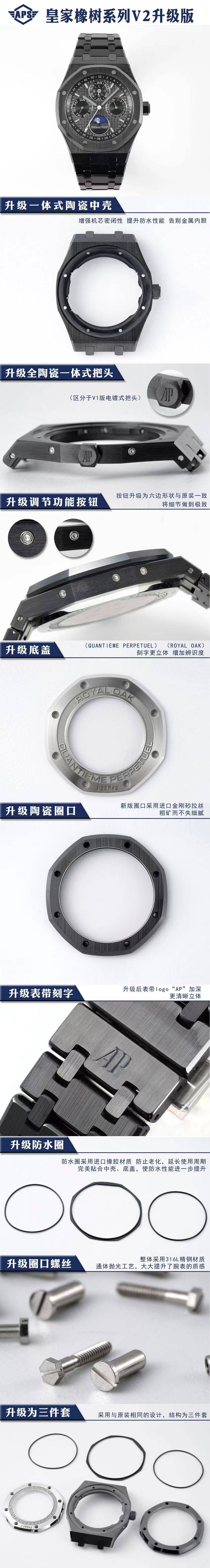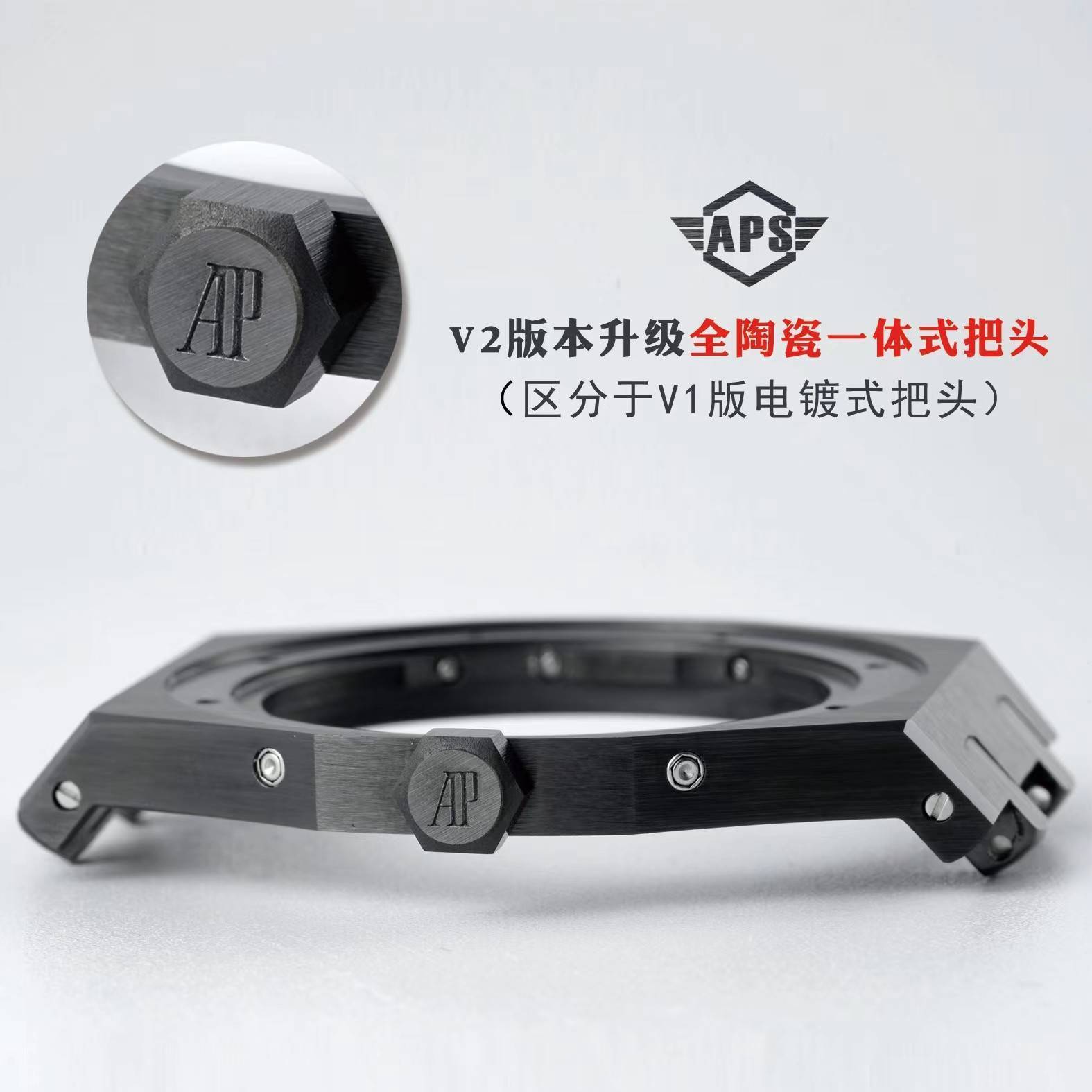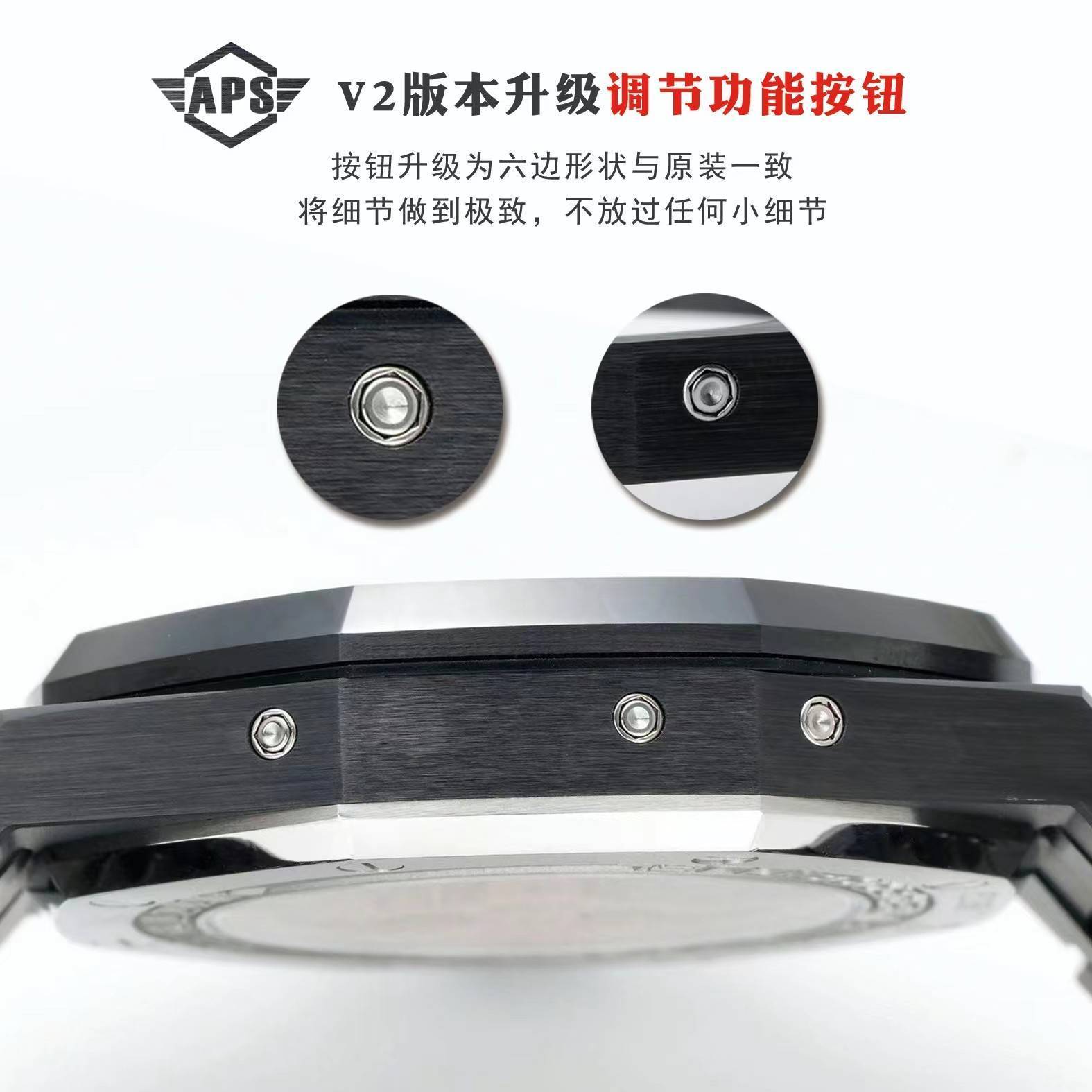 APS V2版26579CE黑陶瓷,数量有限先到先得,全新升级如下 1.表壳:采用全新设计,一体式全陶瓷表壳,永不褪色,剔除金属内胆:使其更具质感 2.按地:全新升级的侧面5颗按地,采用与ZP相同的六边形设计,和表壳的八角型相互辉映,将细节做到极致,一丝不苟 3.把头:升级版采用全陶瓷式一体把头,区别于v1版本电镀工艺,加深logo刻字,真正完成永不褪色! 4.底盖:全新升级CNC平面式雕琢,对标原装的苛刻工艺设计,使其刻字愈加平面,编码愈加深化,大大提升了质感 5:圈口:采用进口金刚砂,不时地打磨拉丝工艺,使其圈口愈加细腻,提升整理质感 6:表扣:重新设计陶瓷表扣logo的加工方式,采用平面式雕琢,愈加深邃,更具质感 7:螺丝:新版采用316L精钢材质,通体抛光打磨,加深螺纹设计,使v2版不会再有掉螺丝的痛点 APS如虎添翼,不惜提升成本,力争把细节做到最好做到极致