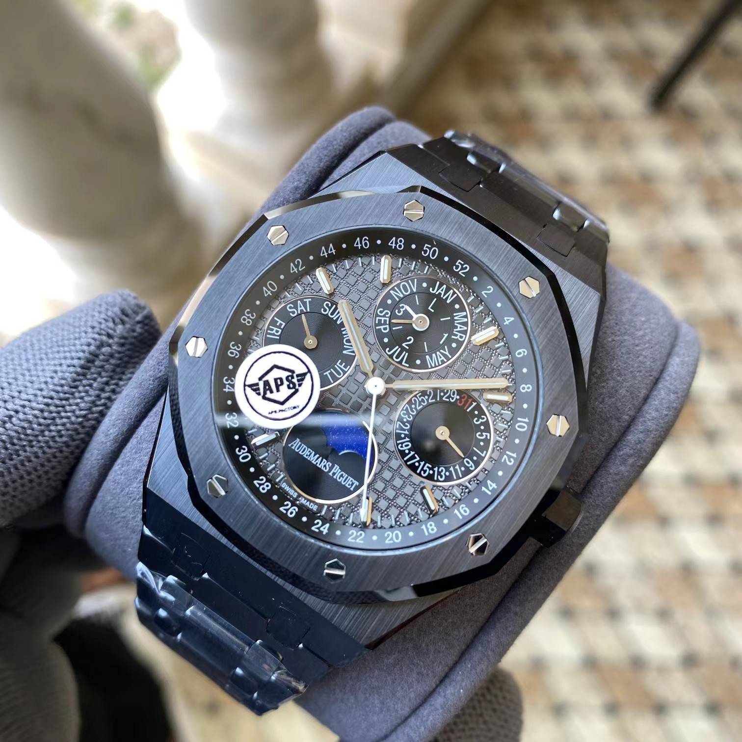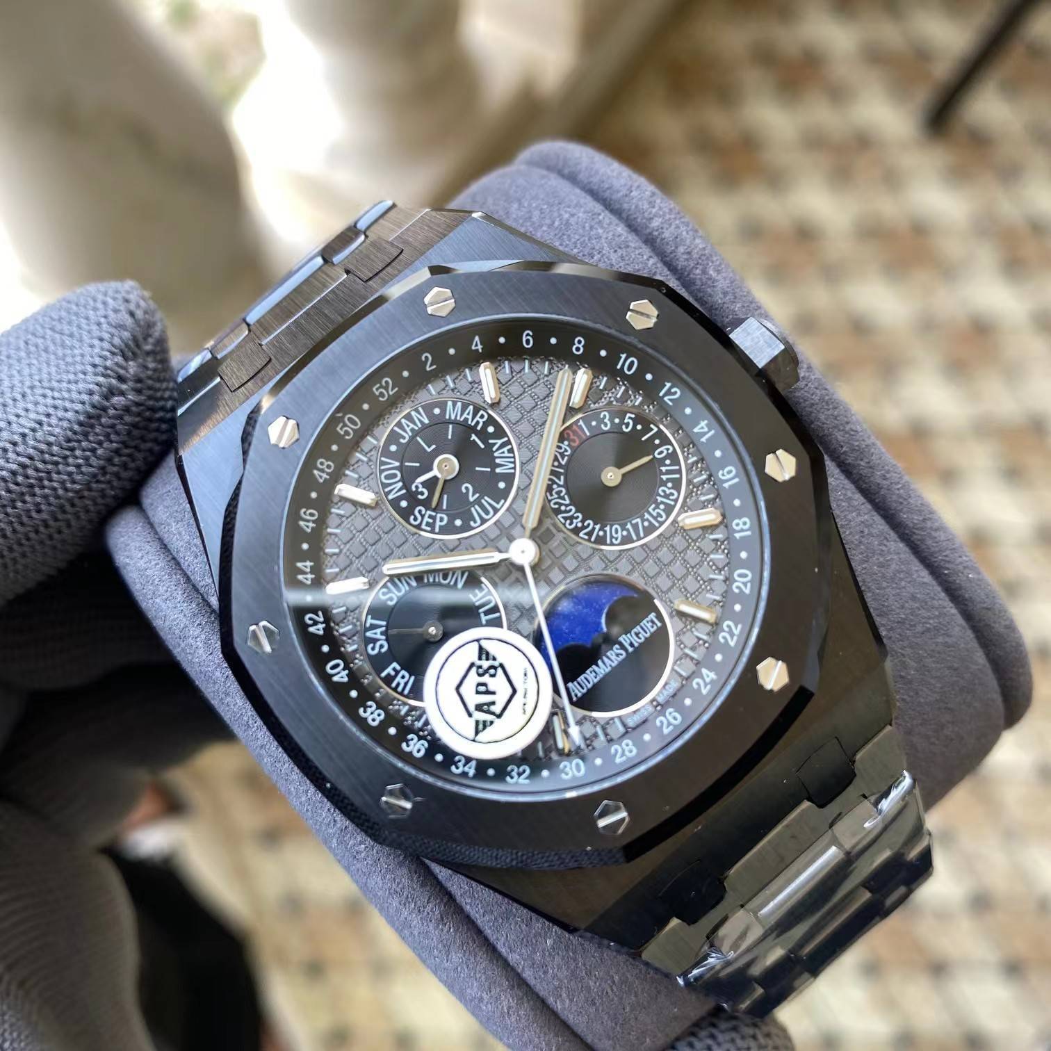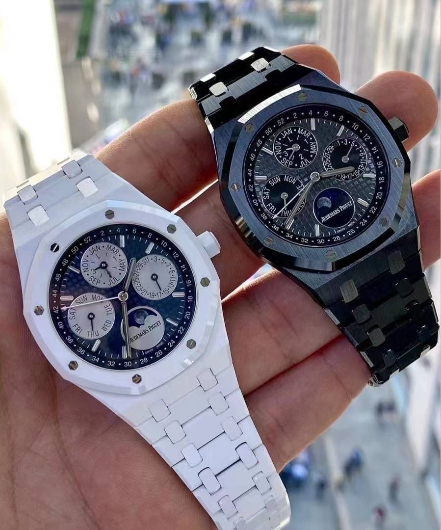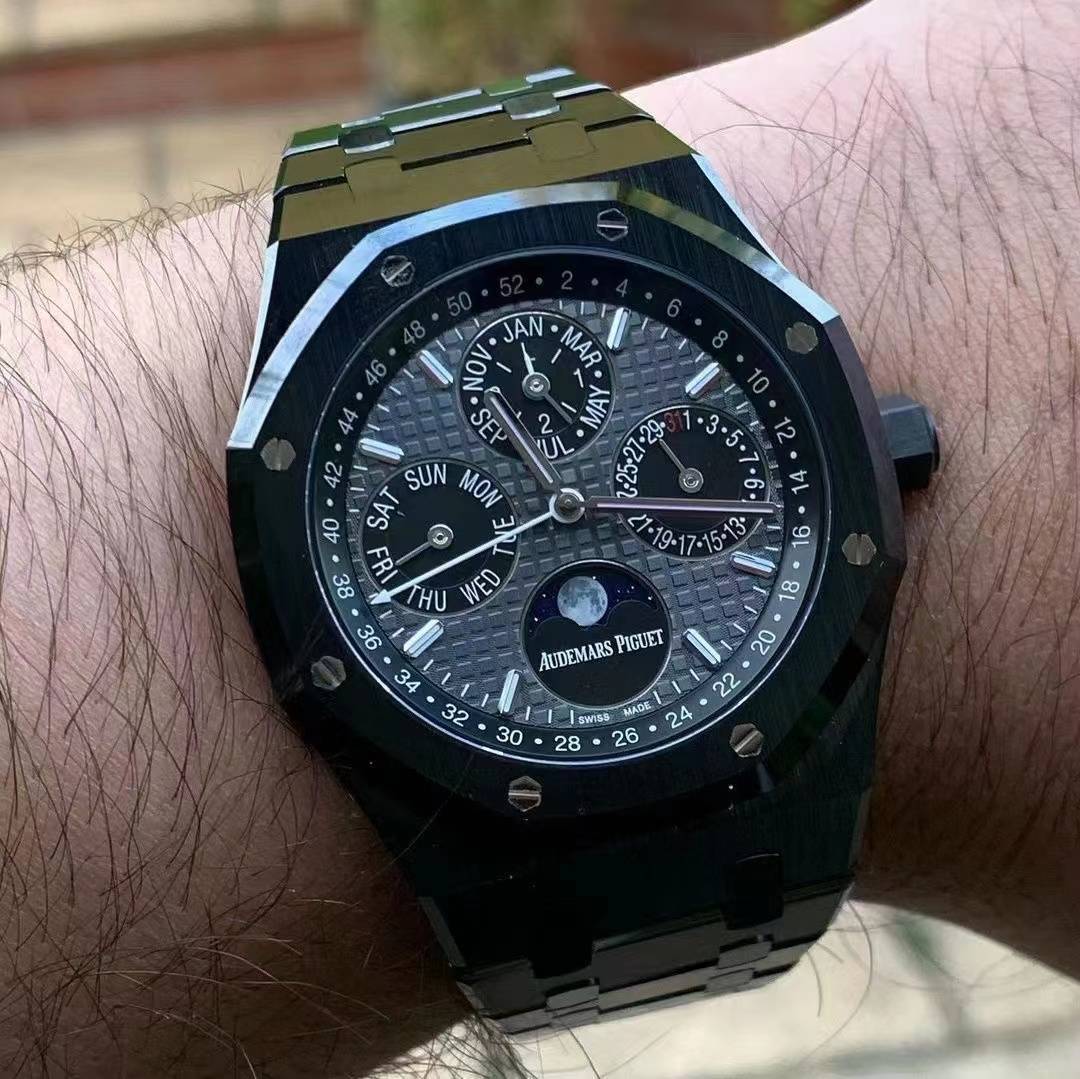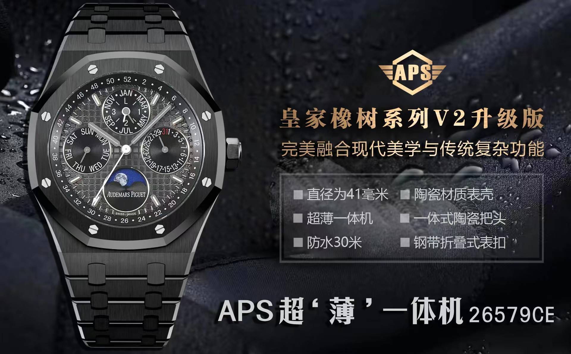 在复刻腕表界中,出品爱彼的玩家在之前引见爱彼的15400和15710的文章中有提及过,JF,ZF,APS就是目前爱彼出品玩家中的三大代表,JF就曾经呈现摆烂状态,在出品进度上也是爱搭不理,曾经垄断爱彼的皇家橡树出品的他目前由于外力要素而选择谨慎自保招致自家出品的腕表逐步被淘汰,而且还是没有售后效劳的,ZF是个全能型的玩家,近些年复刻腕表也是内卷严重,全能型的玩家也开端见缝插针,看见JF的位置逐步的空出来了,就出品了爱彼的钢王表款还有橡胶表带的15710和15703,目前APS是称霸了爱彼了的钢王表款15400和15500,还有爱彼的15710和15703,就是由于APS搭载上了一体的3120机芯,其实APS一开端在市面上被熟知是由于他出品了爱彼万年历26579型号腕表,这个万年历26579在之前市面上是没有出品的,加上这款腕表当时出品的是全白陶瓷的表款,外观是十分亮眼的,固然功用性上还有机芯上是没有做到真正的恢复,但是整表的外观就是带着会有回头率的腕表,这期我们测评下全黑陶瓷的爱彼皇家橡树万年历26579升级的V2版,全白陶瓷还未升级。