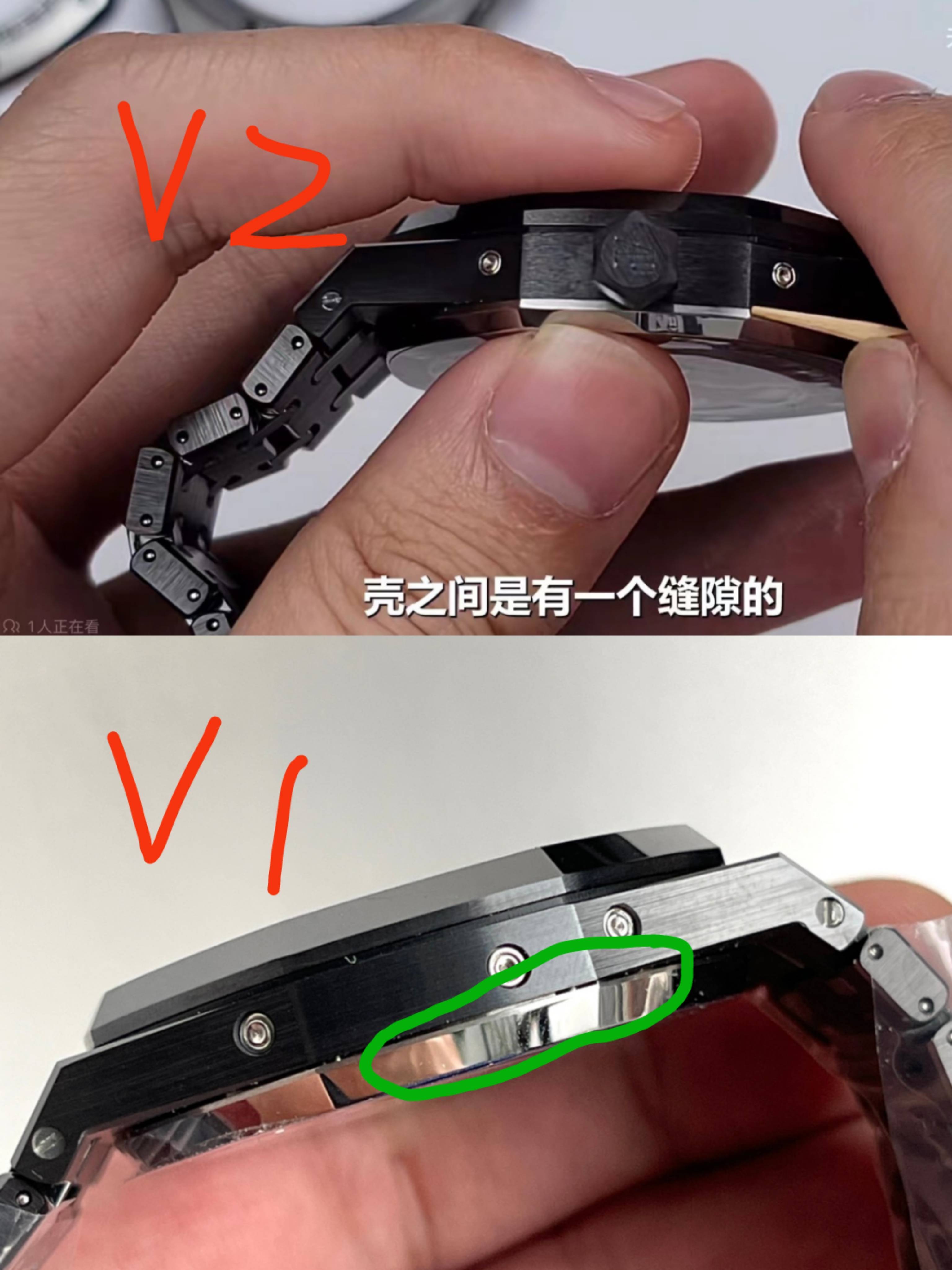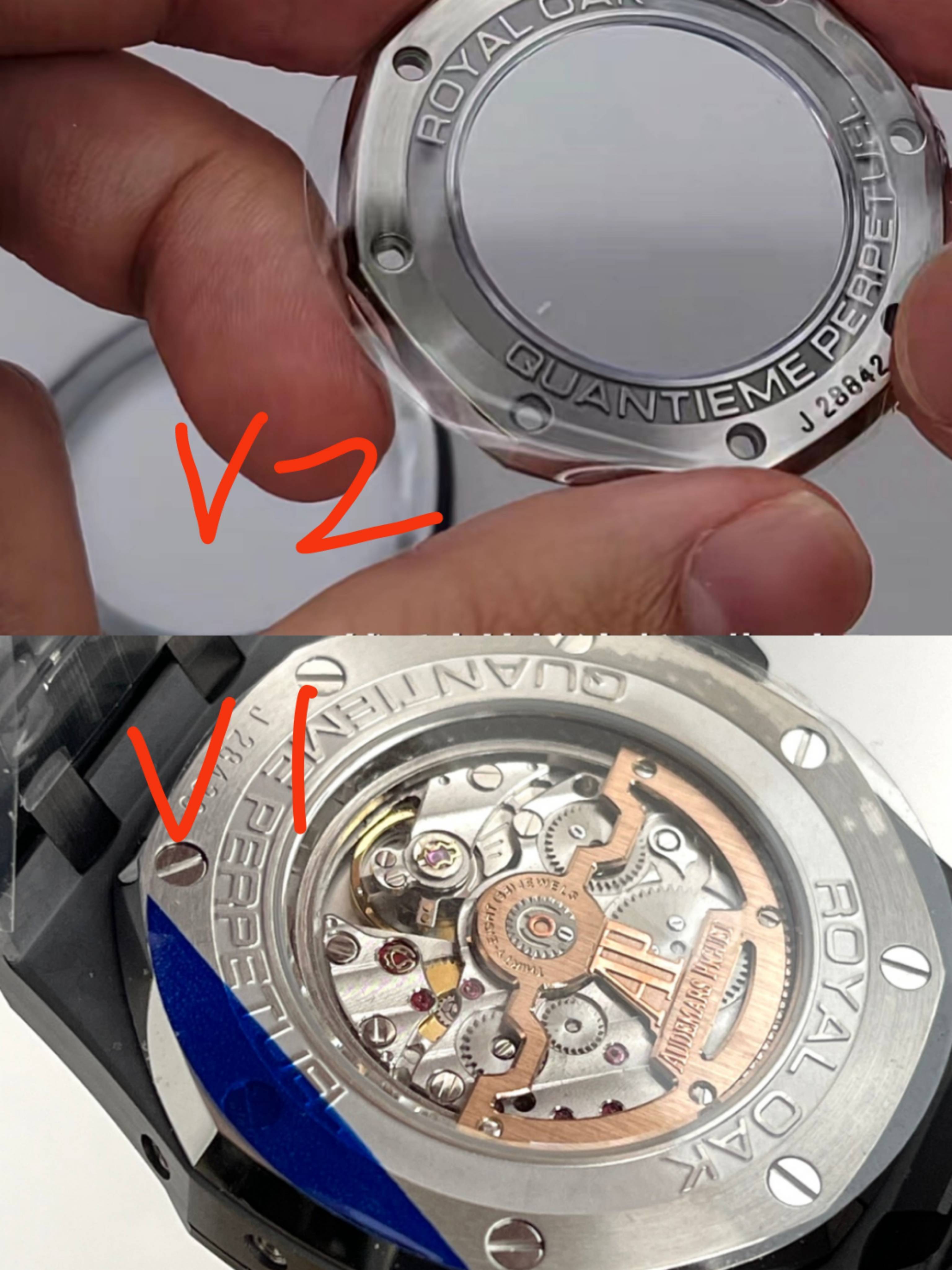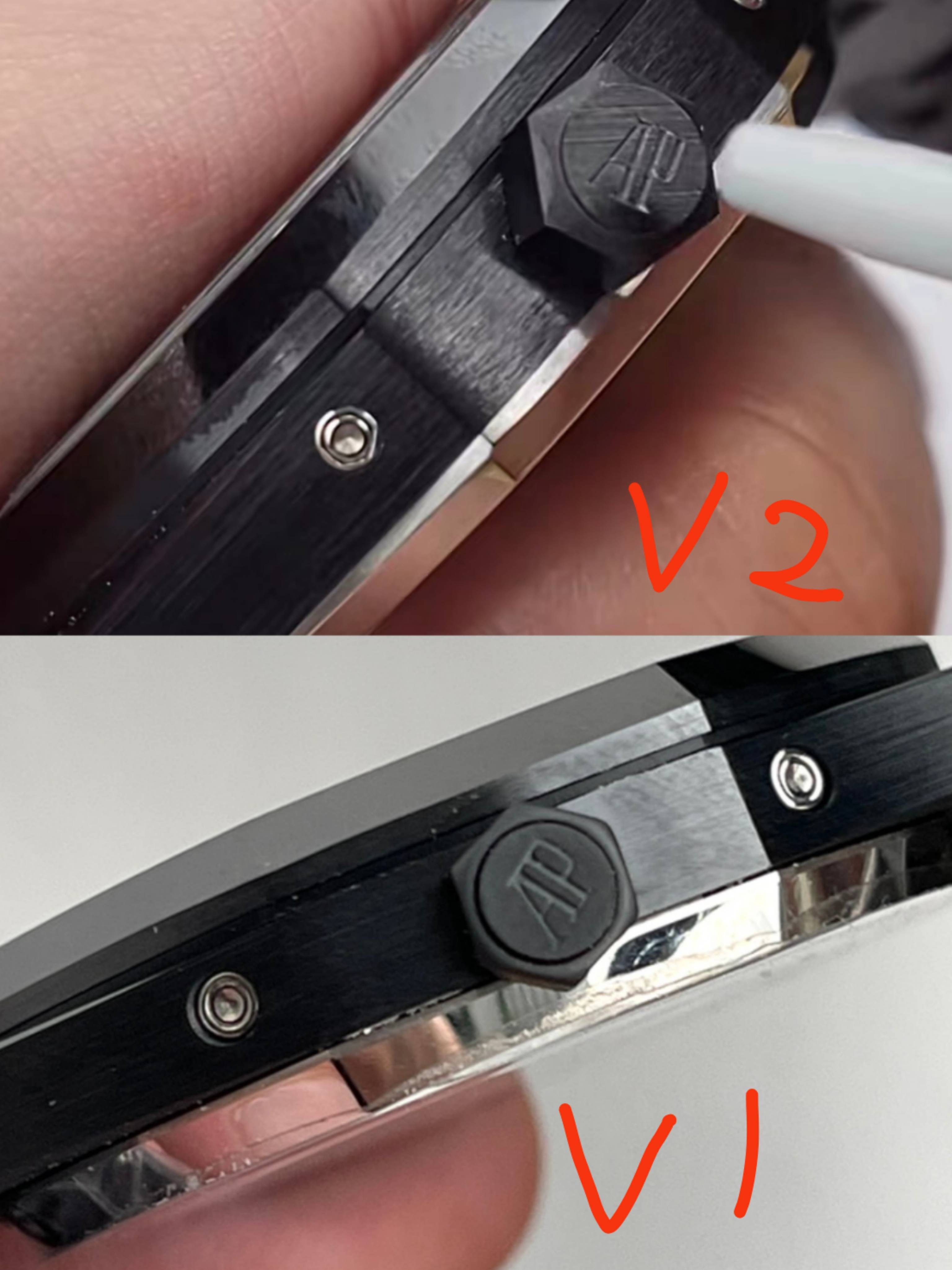 这次的升级并没有对机芯中止升级,这个万年历假如出了一体机芯那就凶猛了,固然说目前工艺还是高不可攀的,但是听闻明年会出品一个一体的多功用机芯,能否可用于这个腕表就得后期才知道了,这次升级的都是一个外观件,还有外观细节,APS制表的态度真的是能够,这次升级的表壳三件套,中间的壳之前用的是镀黑钢的,固然是看不到的中央,但是还是升级了全陶瓷的材质,防水性能也做了升级,用了三层的防水胶圈,并且这次连把头也做到了陶瓷材质,所以整个腕表除了底盖不是陶瓷材质,其他的外观件都是黑陶瓷材质的,底盖也做了升级,刻字更平面,增加了辨识度,在表扣的爱彼logo,AP两个字母的刻字更深了,更明晰平面,螺丝工艺也升级了316L精钢拉丝,连螺丝都做得很精致,然后在腕表的表壳侧面有些调理孔,也做成了和ZP一样的六边形外形,这边整理了几张对比V1版本的细节,给表友们展示下。