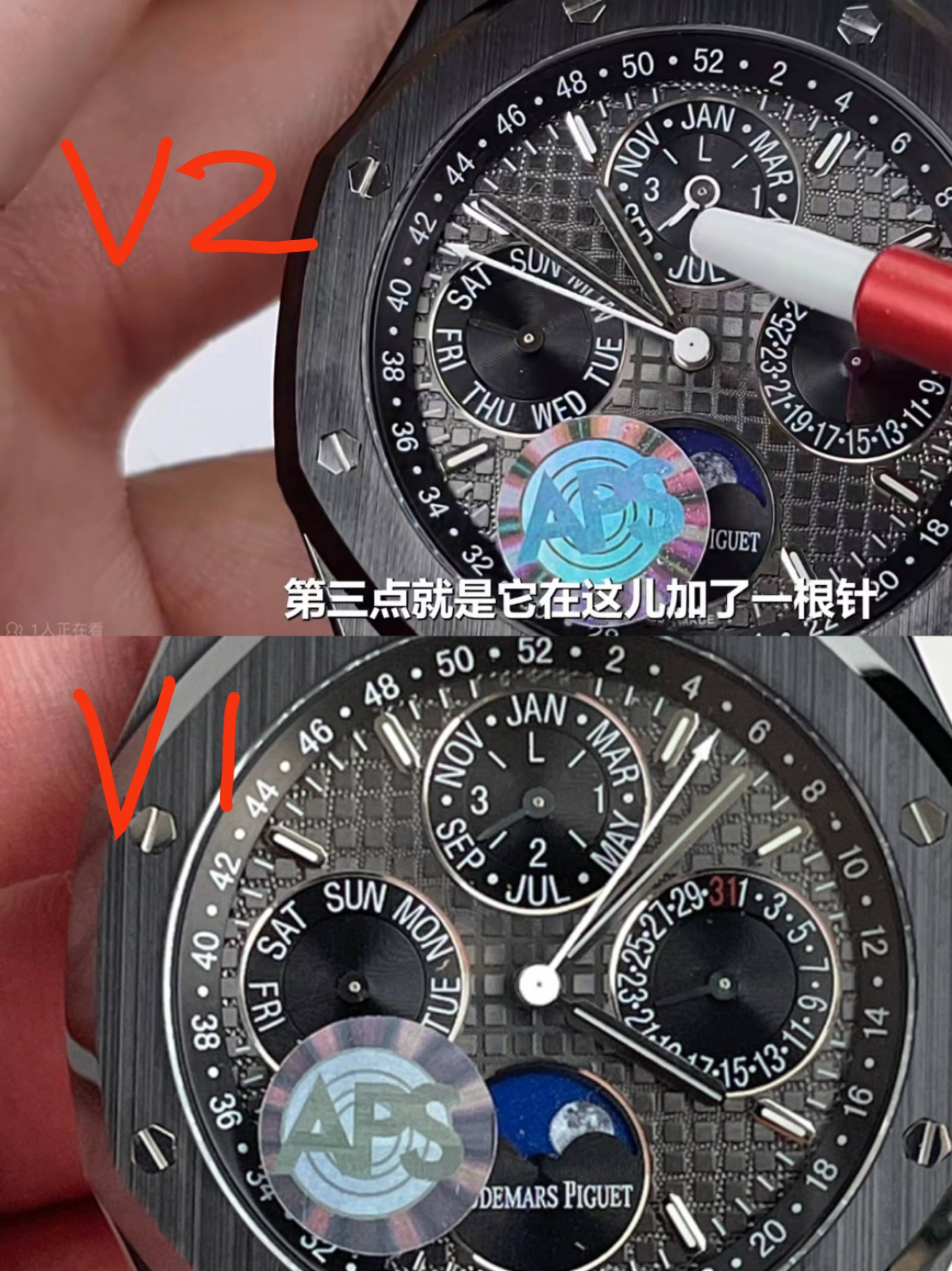 以上是这期腕表的测评,APS的玩表态度是积极认真的,这个样式上机芯是硬伤,这次盘面升级多了一根指针,但是这根指针是没有实践作用的,这种过功用万年历又加月相的腕表是不可能做到功用性一样的,爱彼26579这个样式把头对应另外一个方向的调理孔位也是虚设的,然后带三角形的最上面的针,ZP是装在最下面的,然后是指向星期周数的,一年有52周,但是在APS这个表款上,这就是一根秒针,然后在月相的盘面对比ZP也肯定纹理是不同的,还有机芯搭载的是9015机芯改ZP机芯的,背面的齿轮自然是陈设,不可动的,这点也是一个比较大的辨认点,所以说假如你想玩这款腕表,就只能把这款腕表当成一块复刻去玩,希望后期APS会有更多的升级,也希望明年复刻腕表中会有更多好的机芯作品呈现。