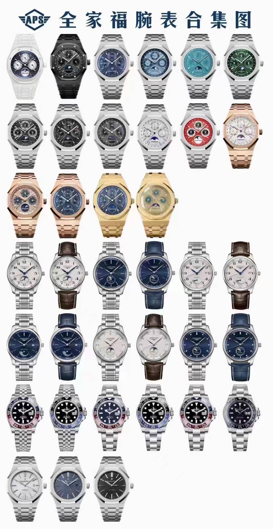 下面给表友们引见下APS出品的全家福产品照,近期还出品了恒宝的经典融合一代和二代,还未加上去,主力产品自然就是爱彼15400和15500还有15710,这三款都是搭载一体机芯,所以即便是背透的设计,整体的恢复度还是很不错的