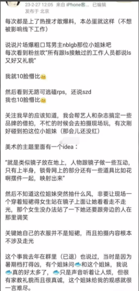 赵露思片场骑马的时分,对吴磊爆粗口的视频发酵起来之后,有一些自称是业内人士的网友,也开端在网上发文,说赵露思爱修图、事儿多、请求多、不敬业,请求工作人员给她一帧一帧地修她的视频,以至在拍广告的时分不背词,仅仅几句广告词也要用提词器。