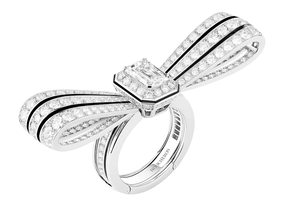 Boucheron 宝诗龙 Histoire de Style Art Déco 高级珠宝系列 Noeud Diamants 戒指 Q:很多人都会在宝石的质量和克拉数之间纠结,您怎样看待这样的问题? A:关于宝石的质量和尺寸,我更看中质量。我曾经为了更深化天文解宝石的秘密,上了古柏林( Gübelin )的珠宝课程,那时分我就发现,真正的珠宝珍藏就如象牙塔普通层层递进,颇有渊源。 当我的了解加深之后会经常问自己:我的珍藏目的是什么?经过思索,还是以为宝石的高质量更吸收我。固然我不认可选珠宝时盲目追求大尺寸,但假如是珍藏极致稀有的高质量宝石,大颗粒也会让我很心动。