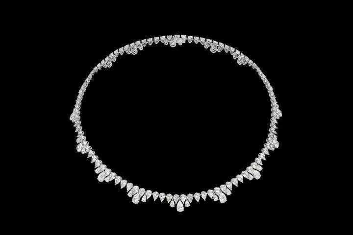 这个系列中结构最复杂的是项链作品,由圆形和水滴形钻石连缀而成,项链中央能够看到一朵耀眼的钻石花,下方搭配圆形、心形、水滴形三枚不同主钻的挂坠,可作为单挂坠项链,或同时搭配三枚挂坠构成华美的项链设计。心形和水滴形钻石亦可悬垂于耳钉下方,构成错误称的耳坠设计。