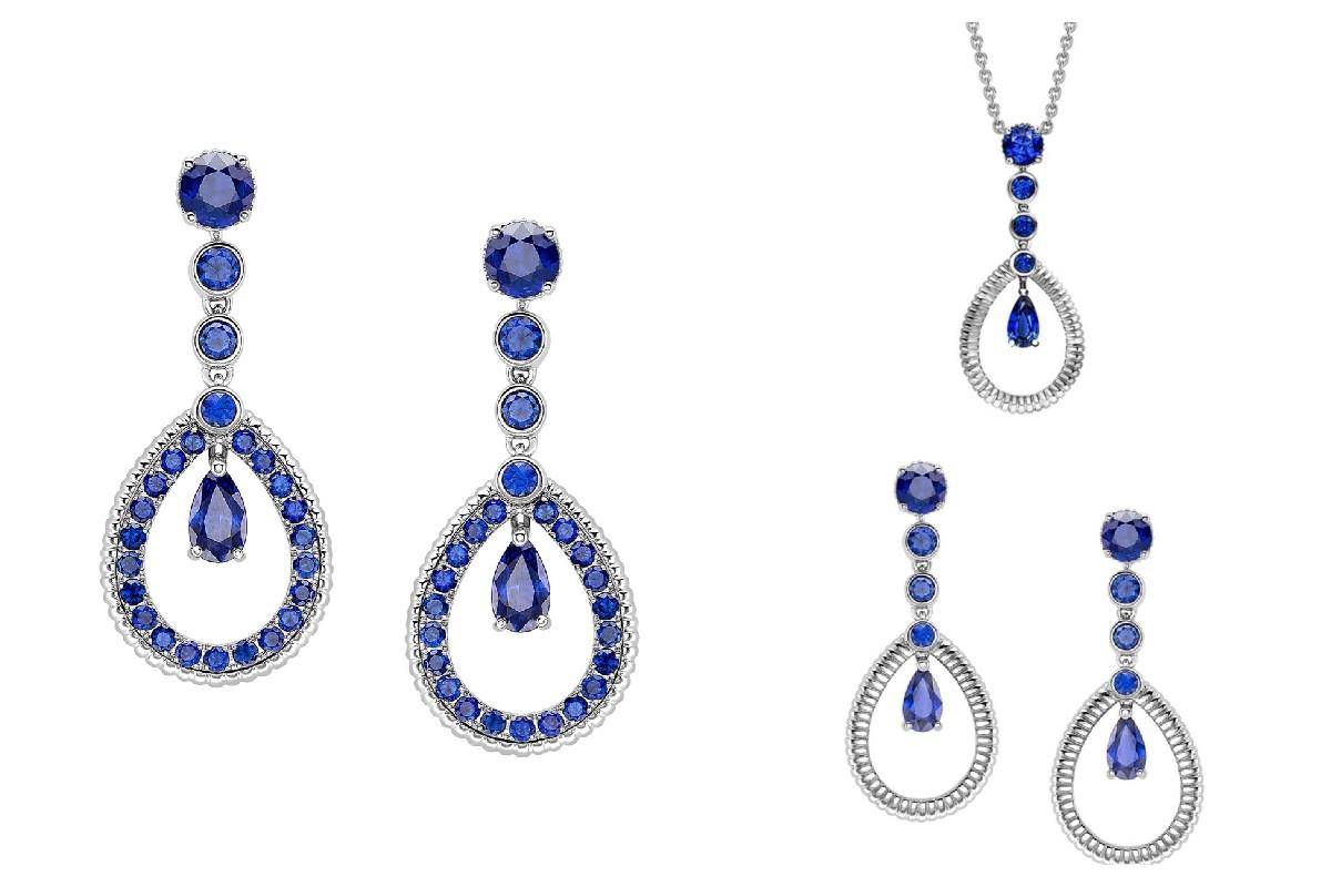 法贝热的这款彩虹色玫瑰金耳坠, 在极简的水滴轮廓设计基础上,以洋气的玫瑰托为底,镶嵌多彩的蓝宝石、红宝石、紫群居网和沙弗莱石等,大小突变的4颗圆形宝石以渐进色或补色颜色排列,水滴外框中间经过三爪镶呈现一颗水滴切割宝石,营造出悬空的视觉效果。 圆形切割宝石是最基本的切割形,难的是大小有序,颜色调和的设计呈现,21颗圆形切割彩宝有序排列镶嵌营造出绚丽的突变彩虹颜色,十分的诱人。 2,彩色宝石与不同金属托的圆满搭配 在法贝尔的这组作品中,能够看到圆满的彩色宝石与不同金属托的搭配计划。