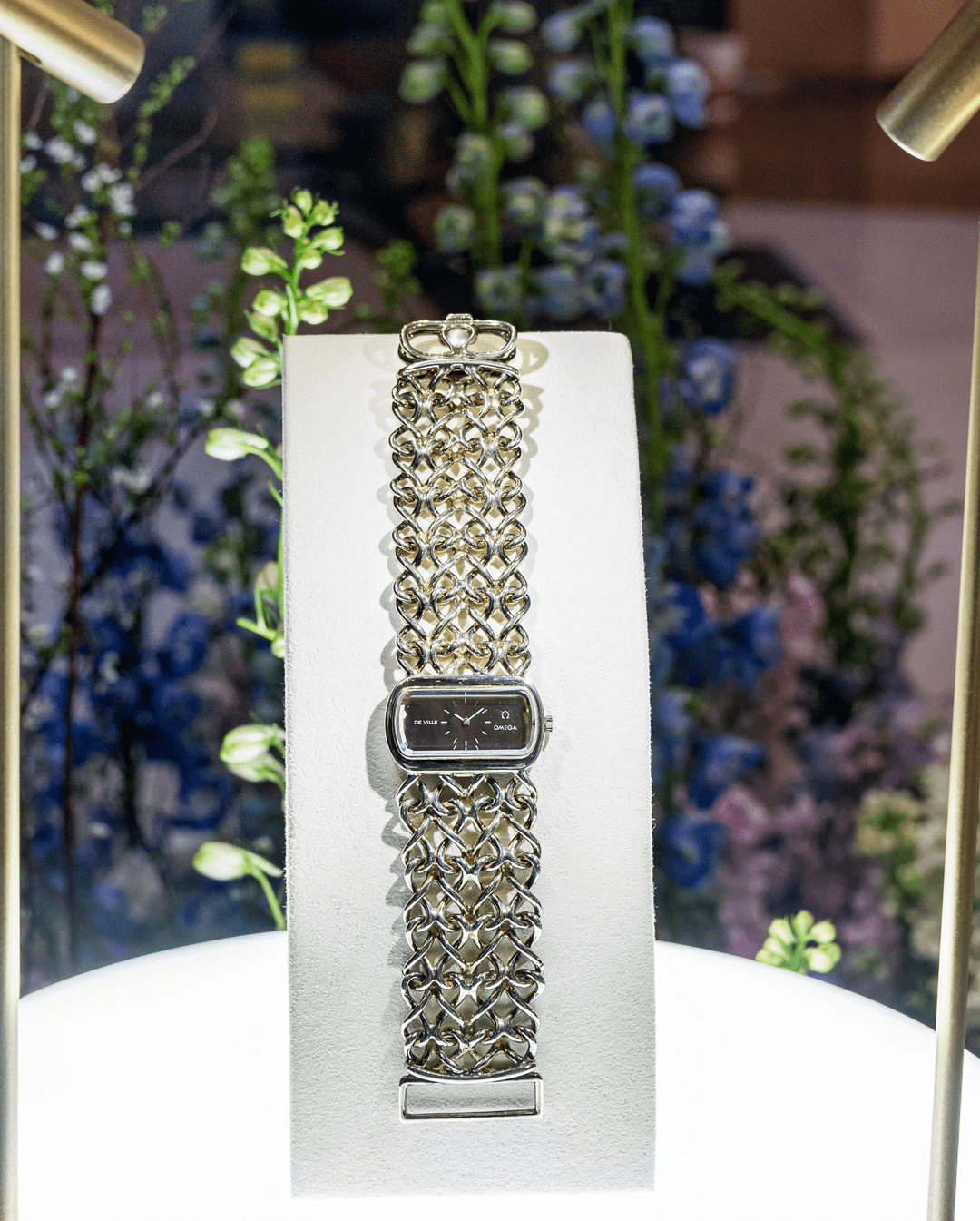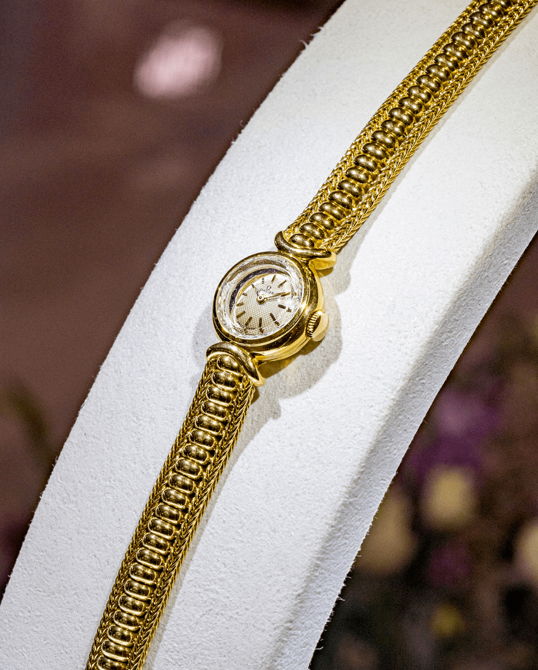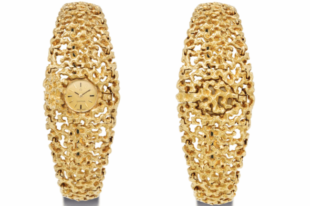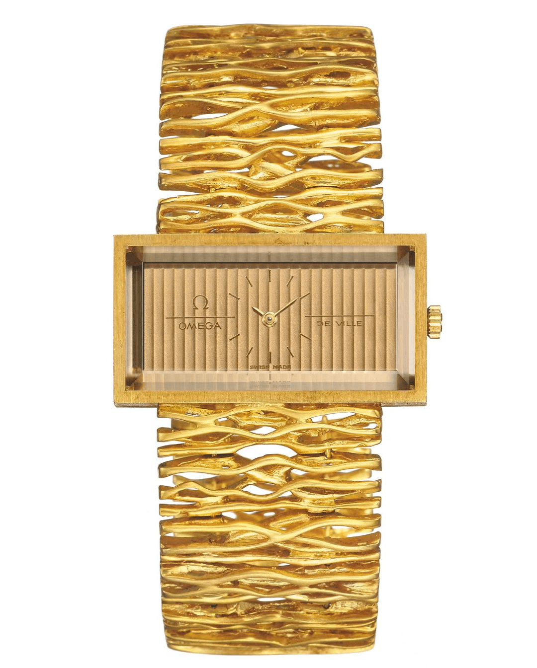 欧米茄古董女士腕表 2015年,佳士得曾上拍一枚与现场展品极为相似的欧米茄装饰艺术作风钻石腕表,曾是民国财政部长、四大家族之一的孔祥熙家族珍藏,成交价约7万港币。 而两位珠宝艺术家Gilbert Albert和Andrew Grima于6、70年代为欧米茄制造的18K金镶钻石链带腕表和碟飞 “Jeux d'Argent”银质腕表,2021年在佳士得和富艺斯分别拍得25万港币和近2万瑞郎。