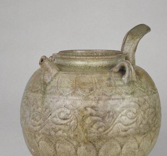 北朝·青釉刻划忍冬纹单柄壶|图源:故宫博物院 忍冬,俗称金银花,忍历严寒而不凋萎,因而得名。