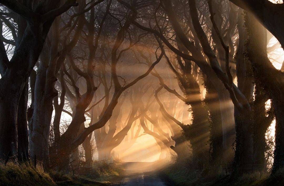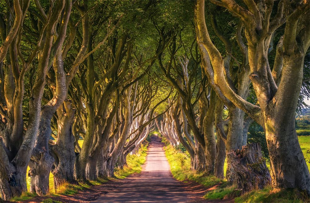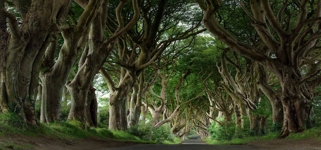 北爱尔兰小村庄埃尔默左近有一条名为 「黑暗树篱」(Dark Hedges)的小路, 路两侧山毛榉树林立,它们错综复杂, 蔚然成荫,使得整条道路深邃成一条童话景色。 刚刚结束的《权益的游戏》中 也有几处在此取景。 第二季第一集中, Arya Stark 伪装成男孩被迫逃出 King's Landing, 走过的King's Road 便是这条黑暗树篱, 所以这里也是权益游戏粉丝的朝圣地。