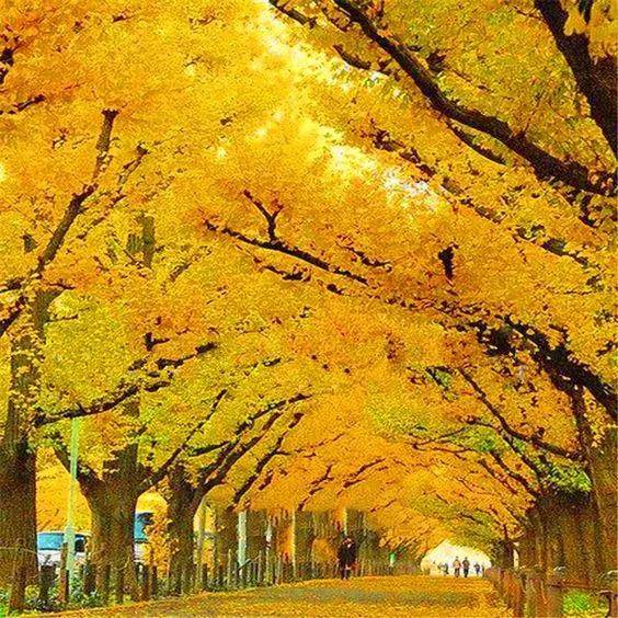 春赏樱花, 秋赏红叶是日本旅游的大众项目, 但是与其跟随冷冷清清的人群, 不如发现一块冷门 但景美的好地儿来的让人欣喜。 东京的街道两旁、 花园和公园里生长着大约6.5万棵银杏树, 座落于明治神宫的外苑的银杏树隧道 就很值得一去。 银杏树在日本文化中备受尊崇。 有六棵银杏树在广岛轰炸中幸存下来, 并生长至今。 日自己将银杏视为「希望的承载者」, 而银杏也常被称为「活化石」。