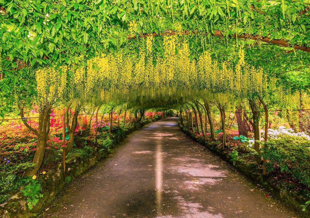 英国博德南特花园金链花隧道, 走廊建于1882年。 位于康威河上游的Bodnant Garden, 花园内种植了很多来自国内外的珍异草植, 可谓英国最美的花园之一。