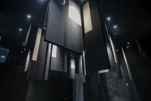 谢天教员现场向观众解说设计理念 “资料不再是单纯地作为一种装饰性的显现,更是意味着生命观照过程中的一个个精彩定格与闪回。”恰如谢天教员所言,“设计将资料视觉作为生命观照中的一个片段,经过与整体的黑色背景相碰撞,试图表示出整个生命过程中的精彩瞬间。岩板的资料性与直观感作为可视元素被激光水平仪投射出的红外线所交叉定格。而大面积黑色作为想象的诗意空间,是一种背景而呈现,在空间中,黑色是虚体,意味着生命的无限可能,而红外线是视觉线索,也是与观众沟通的情感符号,而岩板是终间实体,是视觉线索交汇的精彩瞬间……”