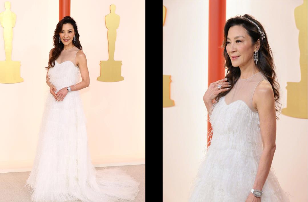 腕表来自Richard Miller; 钻石冠冕、耳环和戒指来自Moussaieff 为杨紫琼颁奖的另外两位奥斯卡影后也同样明艳动人,劳模姐穿的是多次协作出经典红毯的Gucci。