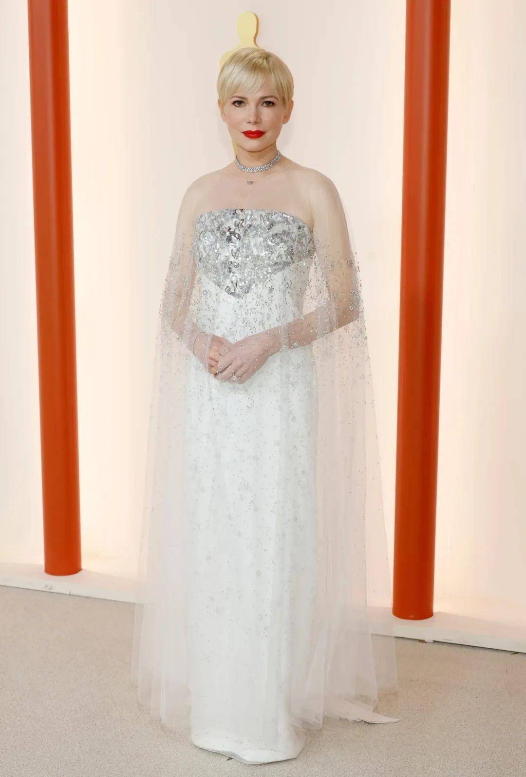 Michelle Williams这套Chanel也超级美,套在身上这件薄纱斗篷,上面全都是满满的手工钉珠刺绣,真的像是一位超级梦境的香奈儿新娘。