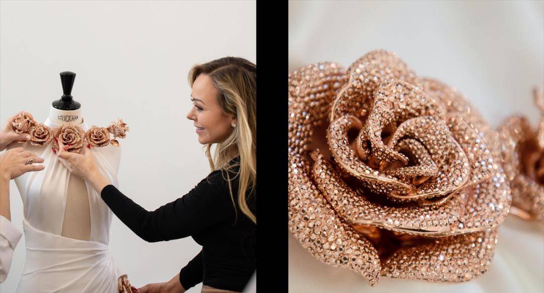 这件领口和胯部金属玫瑰花装饰与轻柔的裙摆相呼应,细节绝美。