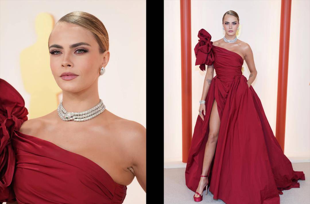 这样民主式的打投,的确让一年一度的女明星大考变得猛烈又残酷起来。截止到下午的时分,好评率排第一的是Cara Delevingne的这套红裙外型。 裙子是来自红毯仙牌Elie Saab,最近大大回春的卡抽还摆出了女明星最爱的红毯“露腿杀”姿势。