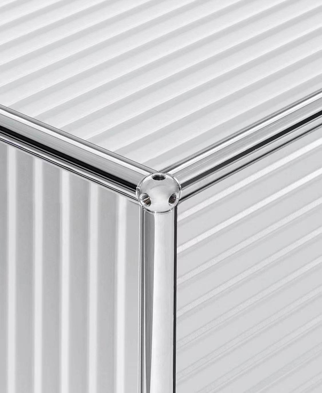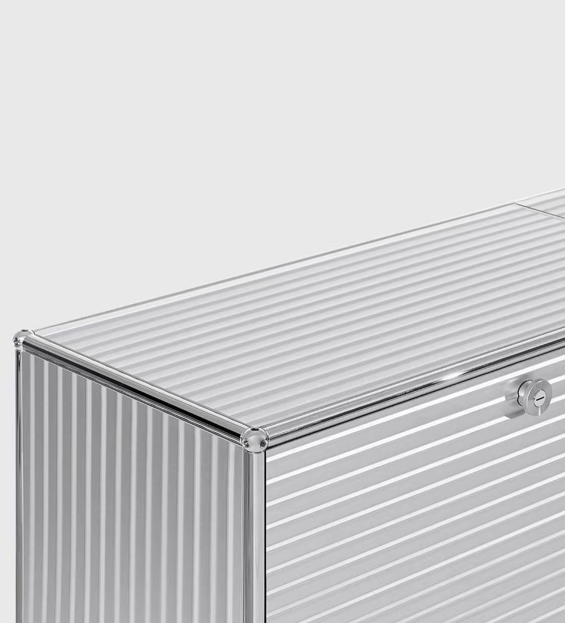 本次Rimowa又与瑞士家具品牌USM Modular Furniture协作推出一款银色的收纳柜,固然这款储物柜还未释出任何出卖信息,却曾经在社交媒体中引发了无数人的谈论与关注。Rimowa x USM Modular Furniture收纳柜采用USM于1960年推出的USM Haller储物柜外型,通体换装成Rimowa经典铝镁合金的凹凸纹饰设计,简约的外型与细节设计圆满契合,呈现出洁净利落,低调奢华的作风。