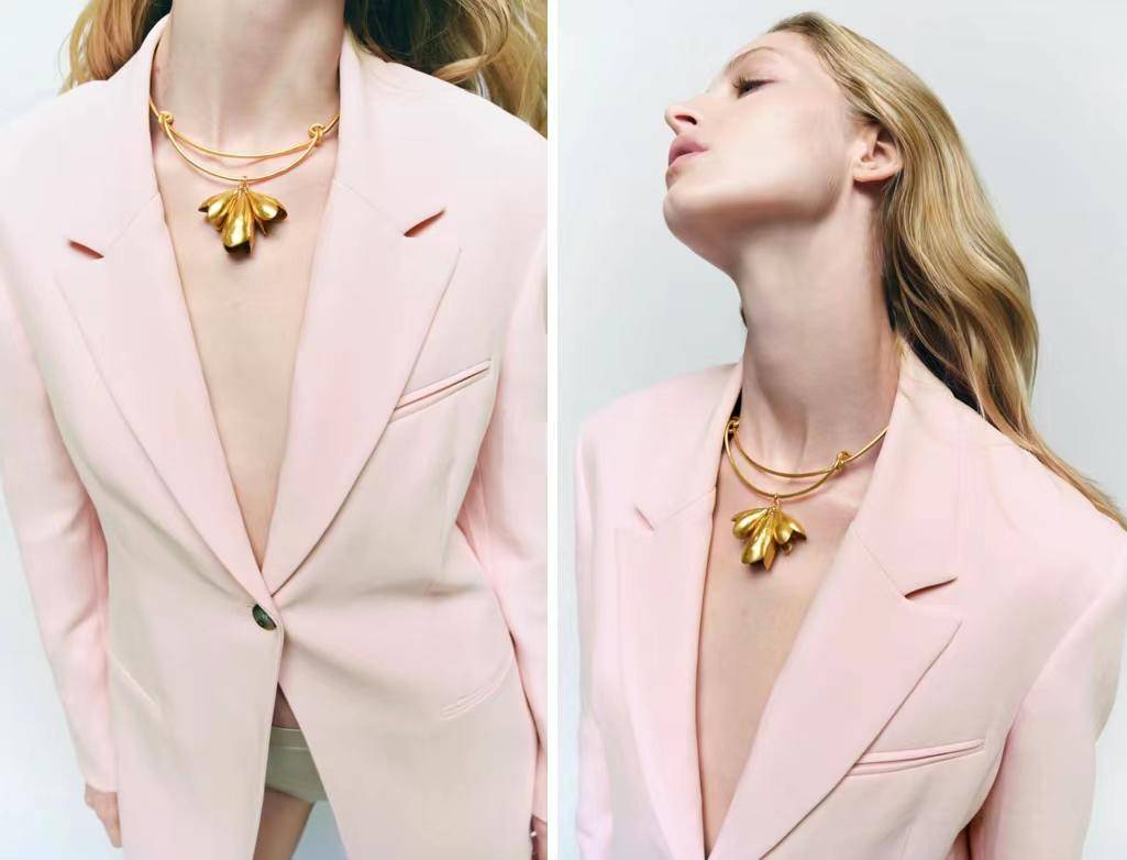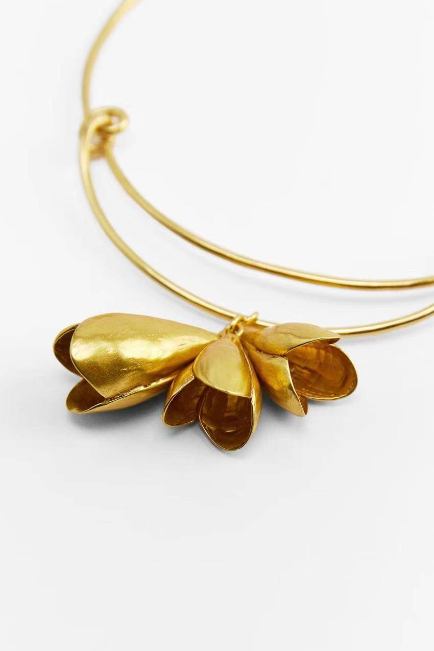 相似铃兰把戏式的硬质金色颈圈项链十分耀眼耀眼,含苞待放的花朵形象加上金色氛围,佩戴时呈现出摩登复古的都市气息,这款同样具有浮夸作风,想要搭配得体,是需求费些心机的。