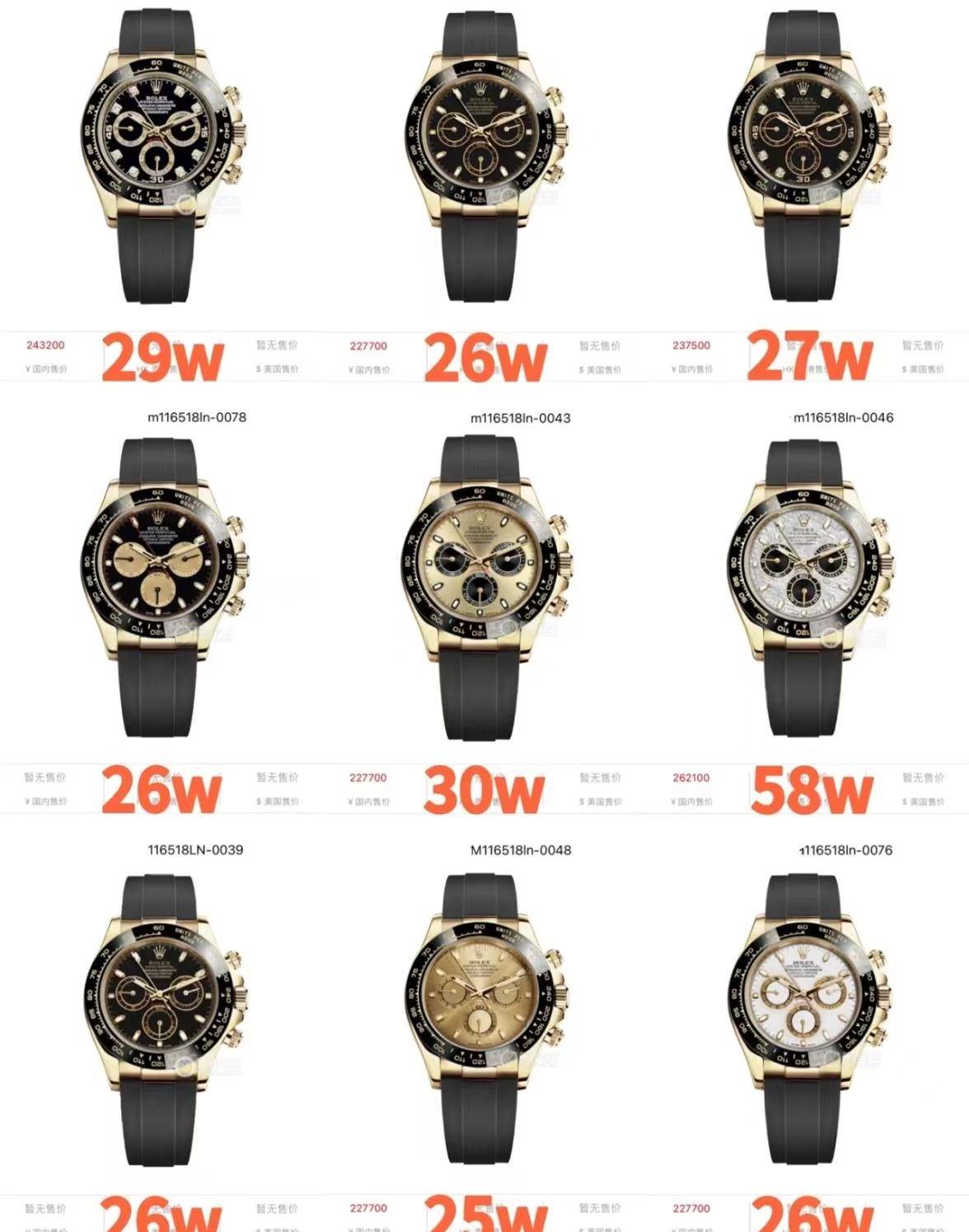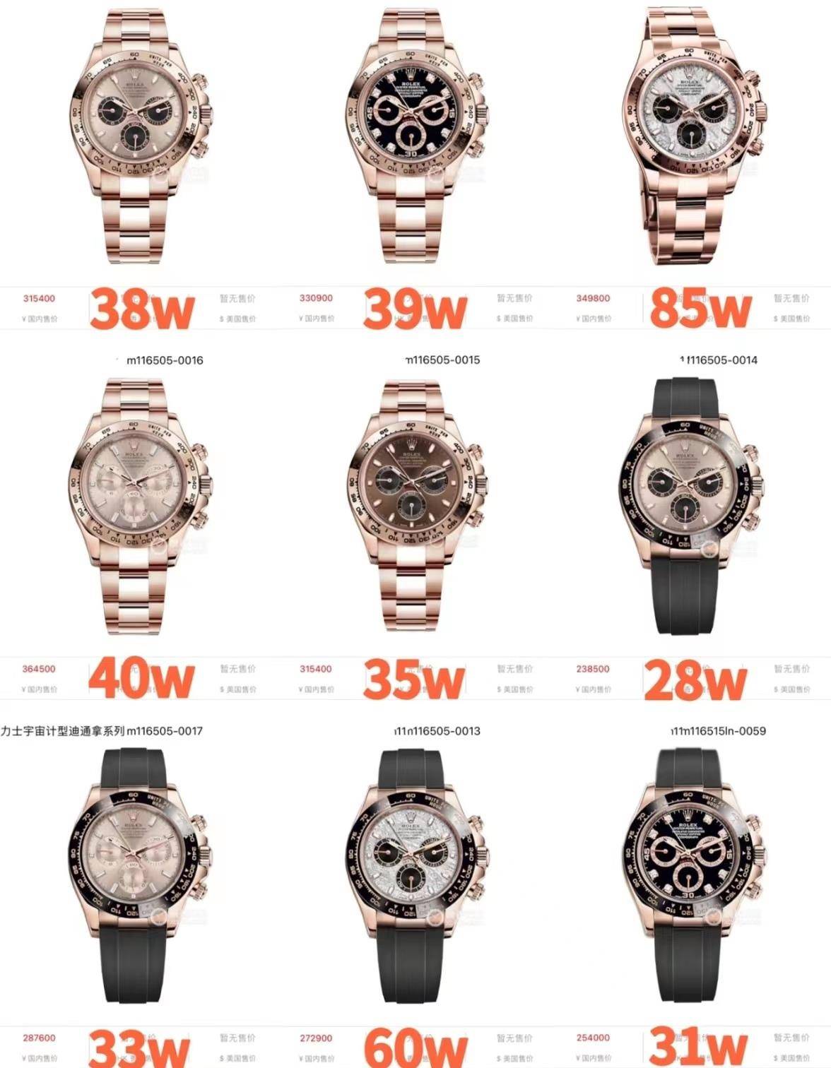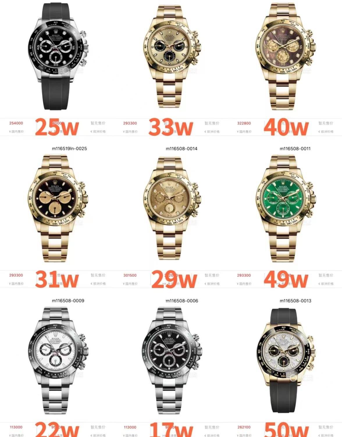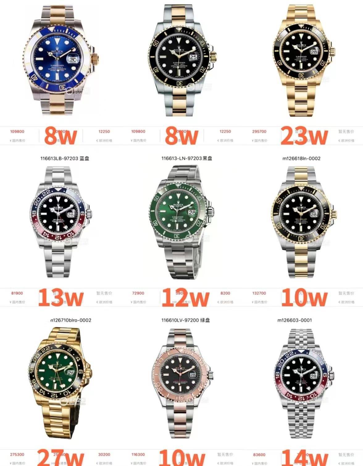 “中国朴素腕表的二级市场阅历了一场骚动,从去年的一路高涨到近期的接连下跌,“富人正在忙着兜售朴素腕表”的音讯也不时传来。究竟是受经济下行影响高端腕表的位置不再,还是市场正在阅历常规调整?不少专家更达观地倾向于后者,并表示看好中国腕表藏家在未来对整个市场的推进作用”。 最近劳力士价钱又基本稳定了,很多表之前跌的曾经不像样子了,最近比较达观了,很多表基本要到工价了,间金黑,间金蓝,往常工价快能买到了,很多大金劳,曾经开端打折了,今天我们接着聊一下细致的样式。 1.绿金迪,曾经的王者,稳稳地90+行情,之前过去的两个月基本稳定在50大的行情,往常是50+的行情,价钱也是回落了很多。 2.白熊猫,黑熊猫的价钱,也是比较稳定了,白色的20出头,黑色的20不到了。 3.全金的迪通拿,往常更是可怕,行情呼呼的落,金眼睛基本在工价徘徊了,贝嫂,余文乐,小怪兽,也是不停地回落,更有甚者,有的曾经开端打折了,这波下跌,迪通拿系列还是比较凶的。 其他日志款更是全线崩盘,行情不忍直视,包含很多客人自己去专柜买也是能够买得到了,所以你觉得行情还会跌吗? 价钱分享 仅供参考