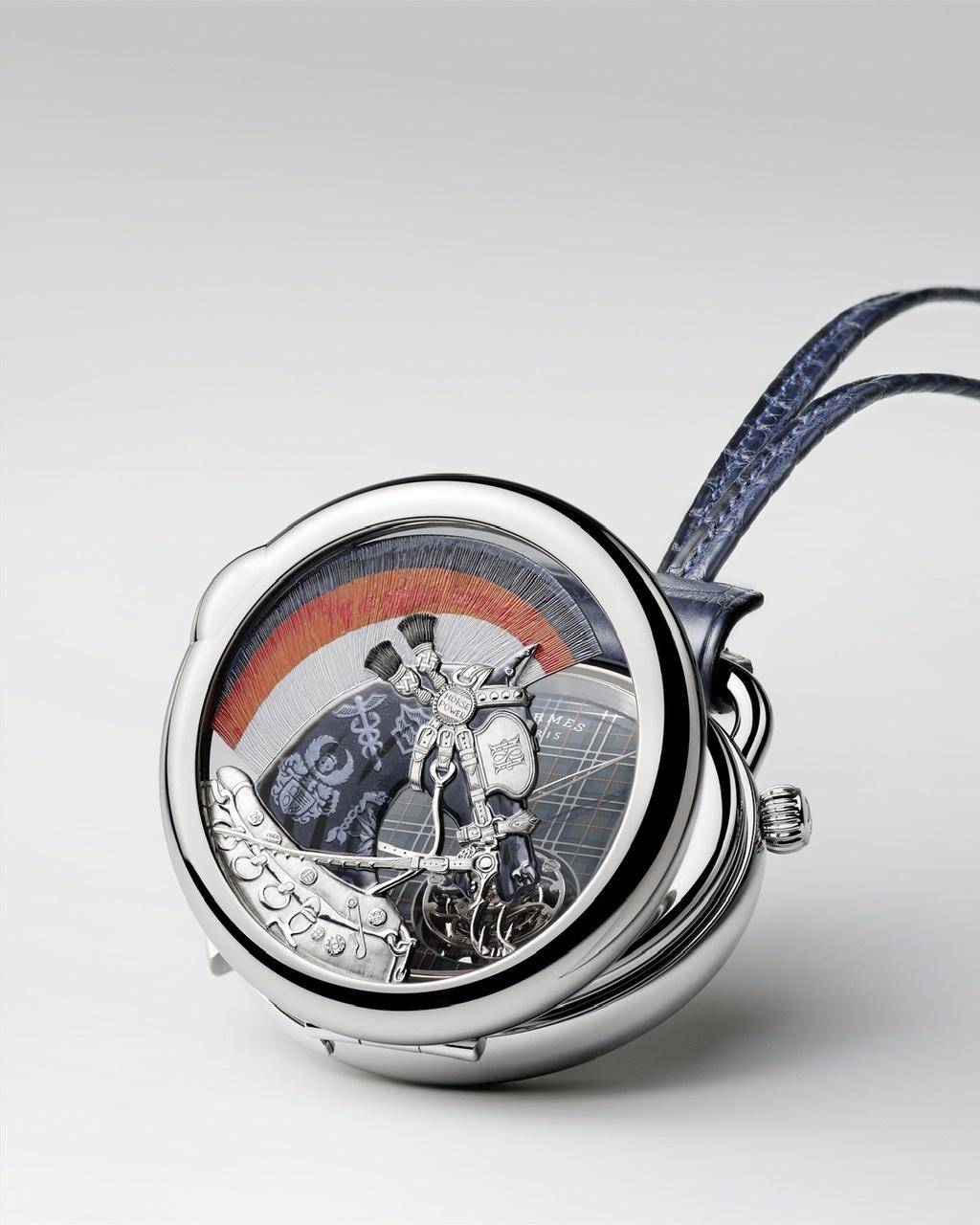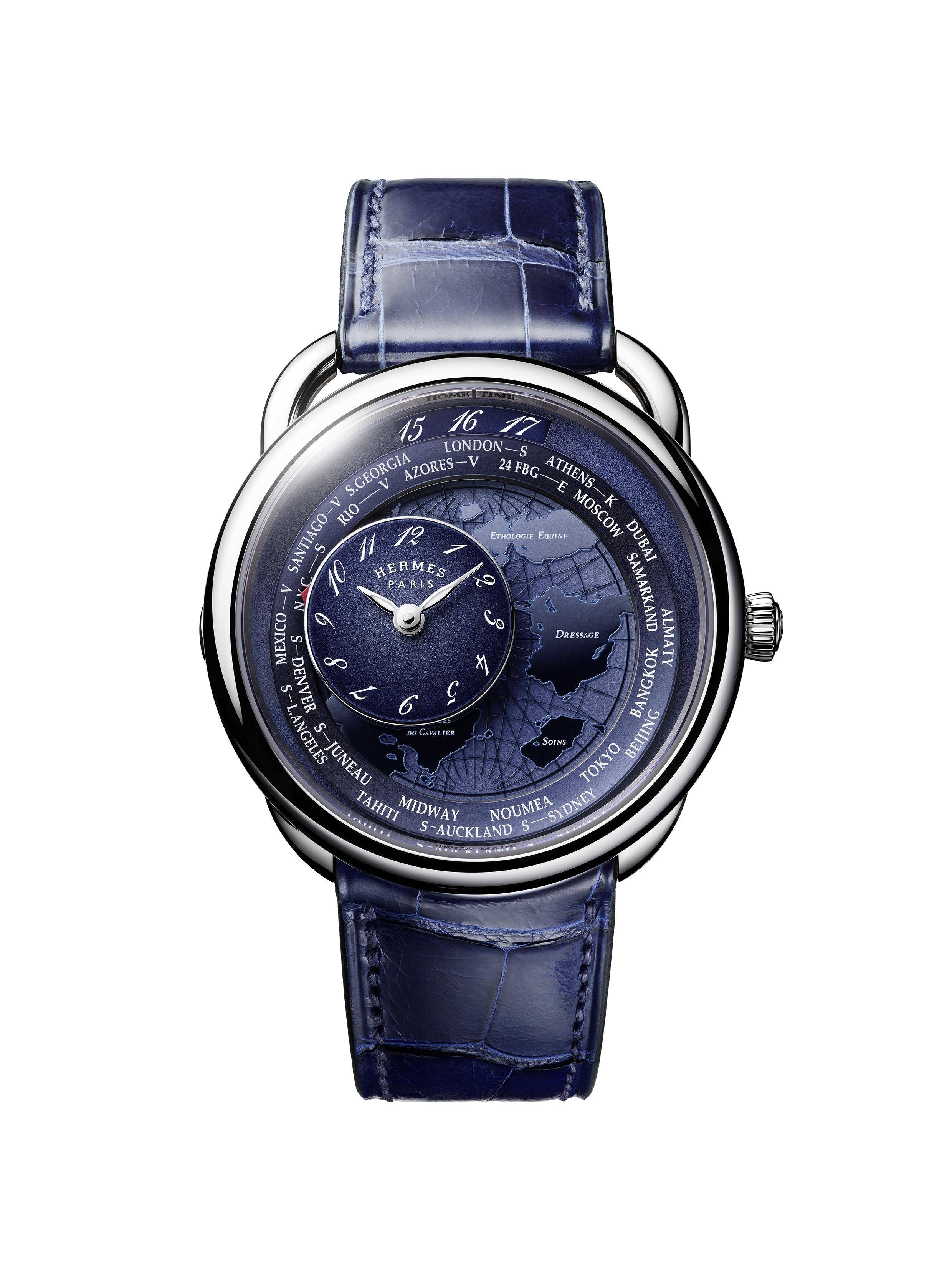经过十几年的积聚,爱马仕经过这些复杂功用腕表表示技术水平的同时,也树立了一个独有的作风美学形象。 以漫游时光腕表为例,这款腕表的特性在于用新颖的手法来展示世界时间这一经典的复杂功用。爱马仕以丝绸部门推出的《世界马术地图》(Planisphère d’un monde équestre)丝巾图案为灵感,在表盘上开发了一个“漫游时光”装置,经过一个圆盘显现全球24个时区。而在靠近9点位的中央叠加了一个活动计时圆盘,如卫星般环绕着虚拟地图旋转,以完成世界时间展示的目的。