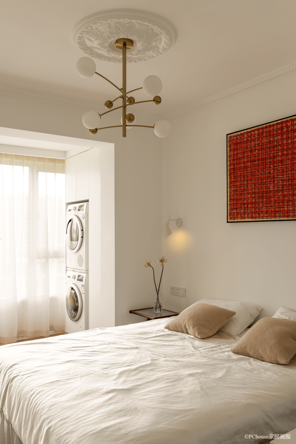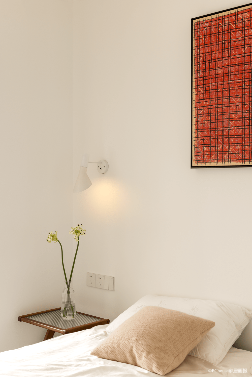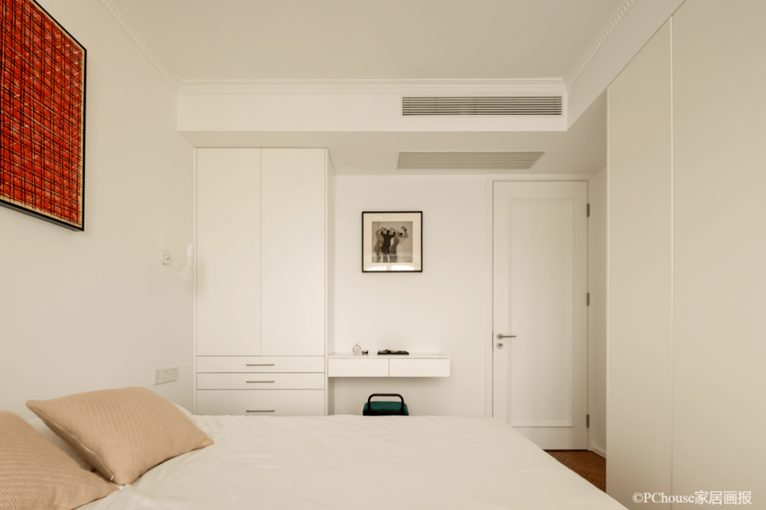 ▲挂画:犀牛艺廊 壁灯:AJ well lamp 去床头迎合整体的极简感,一副红色装饰画瞬间提升卧室作风,搭配简约边几,对称两盏壁灯分发温和光线,油腻自然的睡眠环境不失温馨平和。