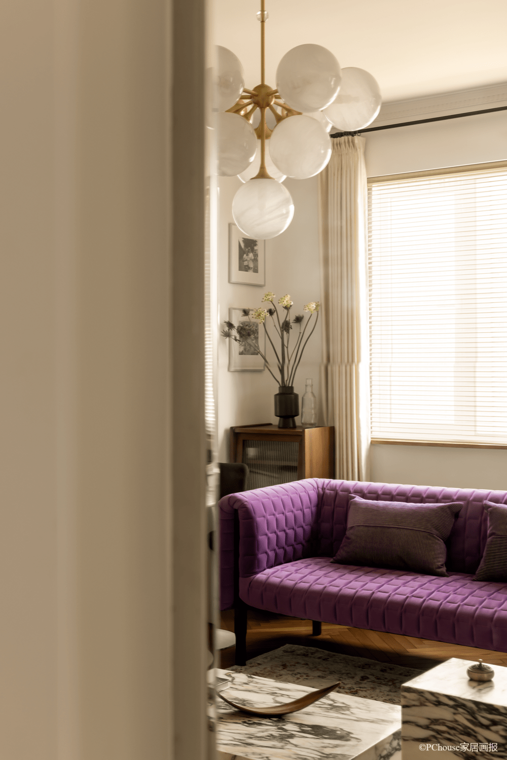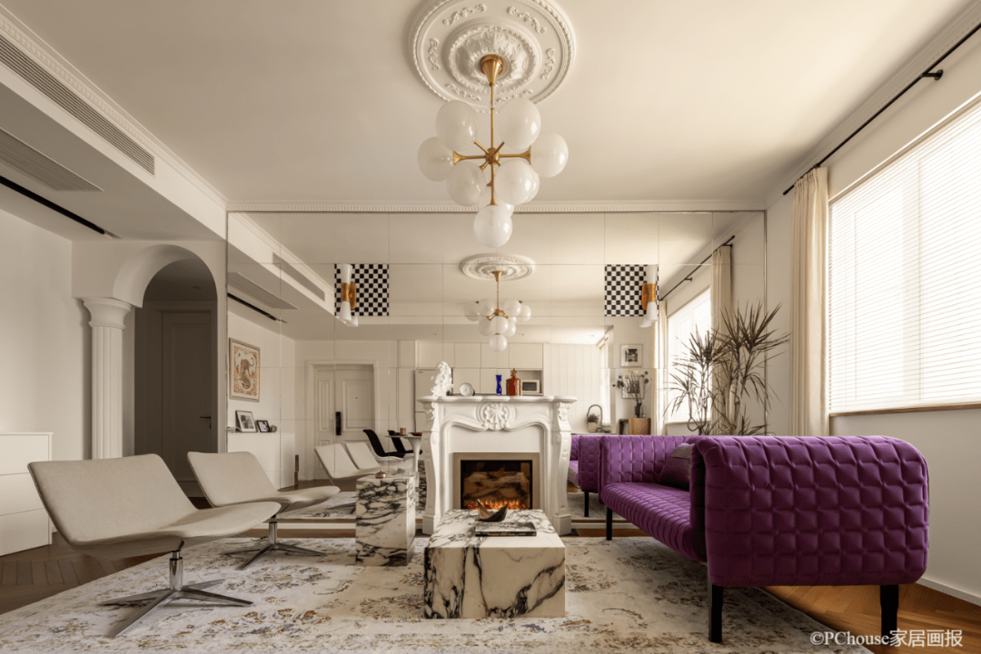 葡萄串吊灯搭配金色支架,精致感随灯光散落各个角落,灯下一张葡萄紫简约沙发,浓郁的颜色成为整个空间的亮点,呈现出高尚的文雅感。