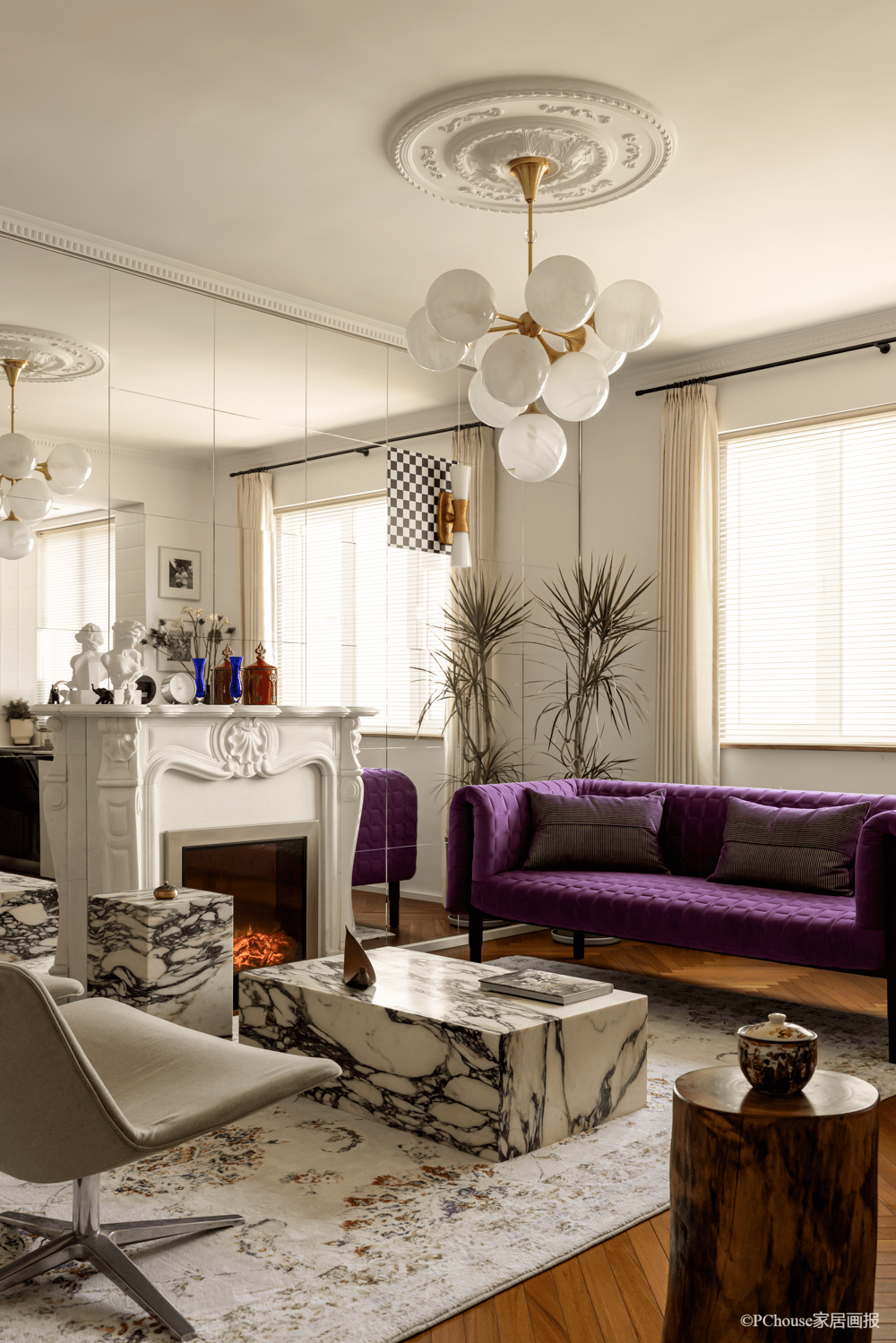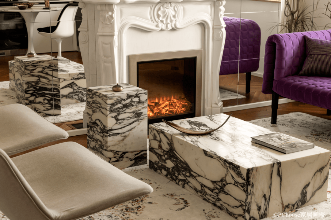 ▲沙发:写意空间 ligne roset 一张复古碎花地毯圈出会客厅区域,解脱常规的摆放方式,客厅呈现轻松的围合式规划,以壁炉和茶几为中心,整体的陈设更有上世纪的复古法式神韵,作风文雅无比。