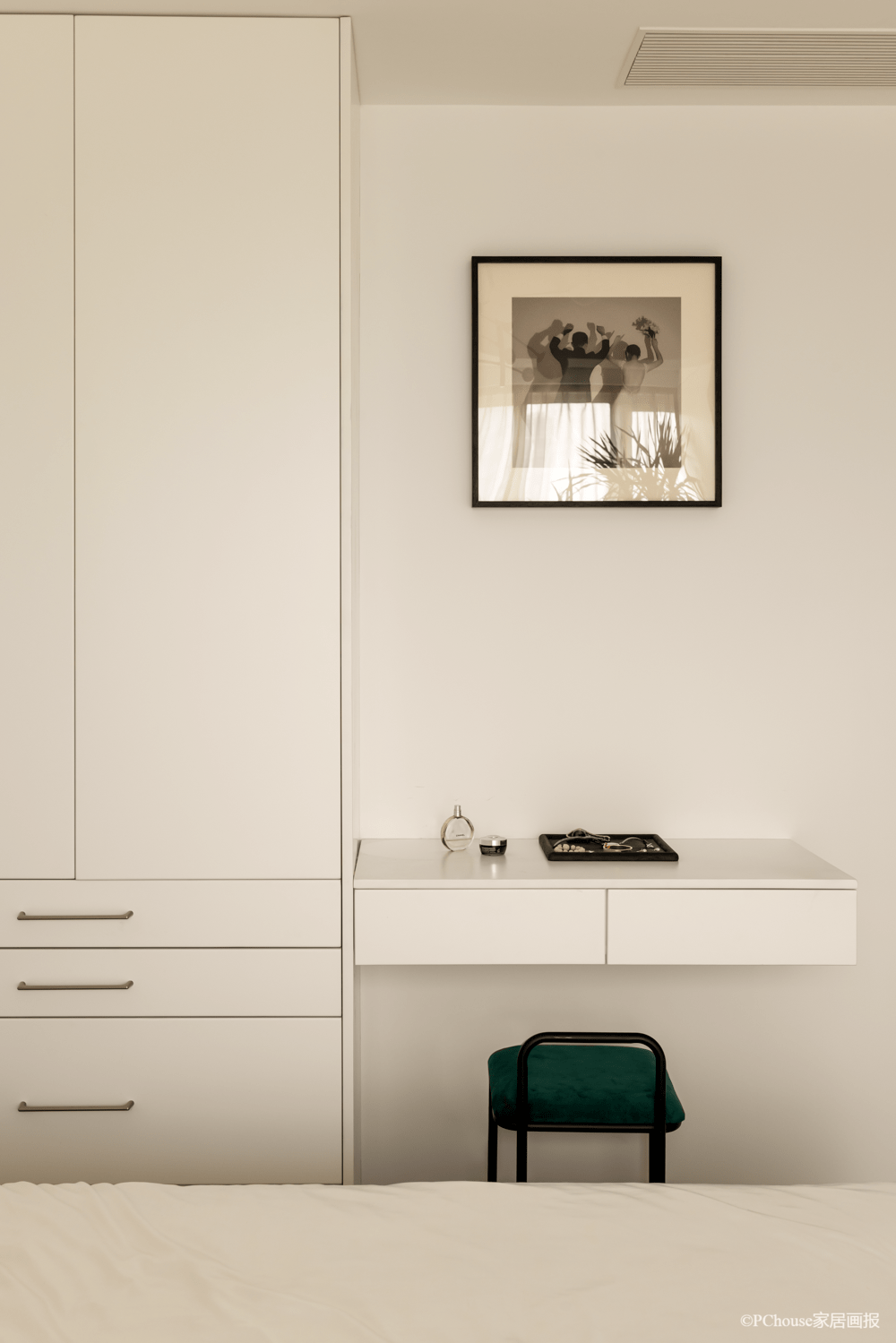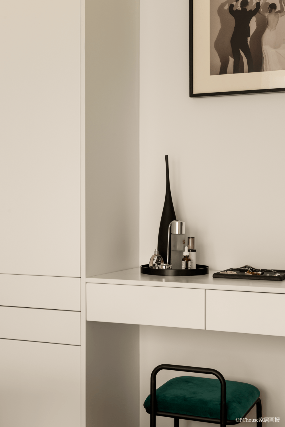 悬浮桌面轻盈小巧,作为女主人的梳妆台,满足一些日用品的收纳贮存,一张墨绿丝绒梳妆凳,瞬间拉回到复古的气息中来。