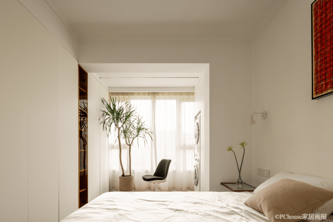 主卧采用同样的大白墙简约化设计,用植物以及绚丽装饰画来装点空间,分发着别致的文雅漠然,“清水出芙蓉”般气质,营造出高级的松弛感。 |