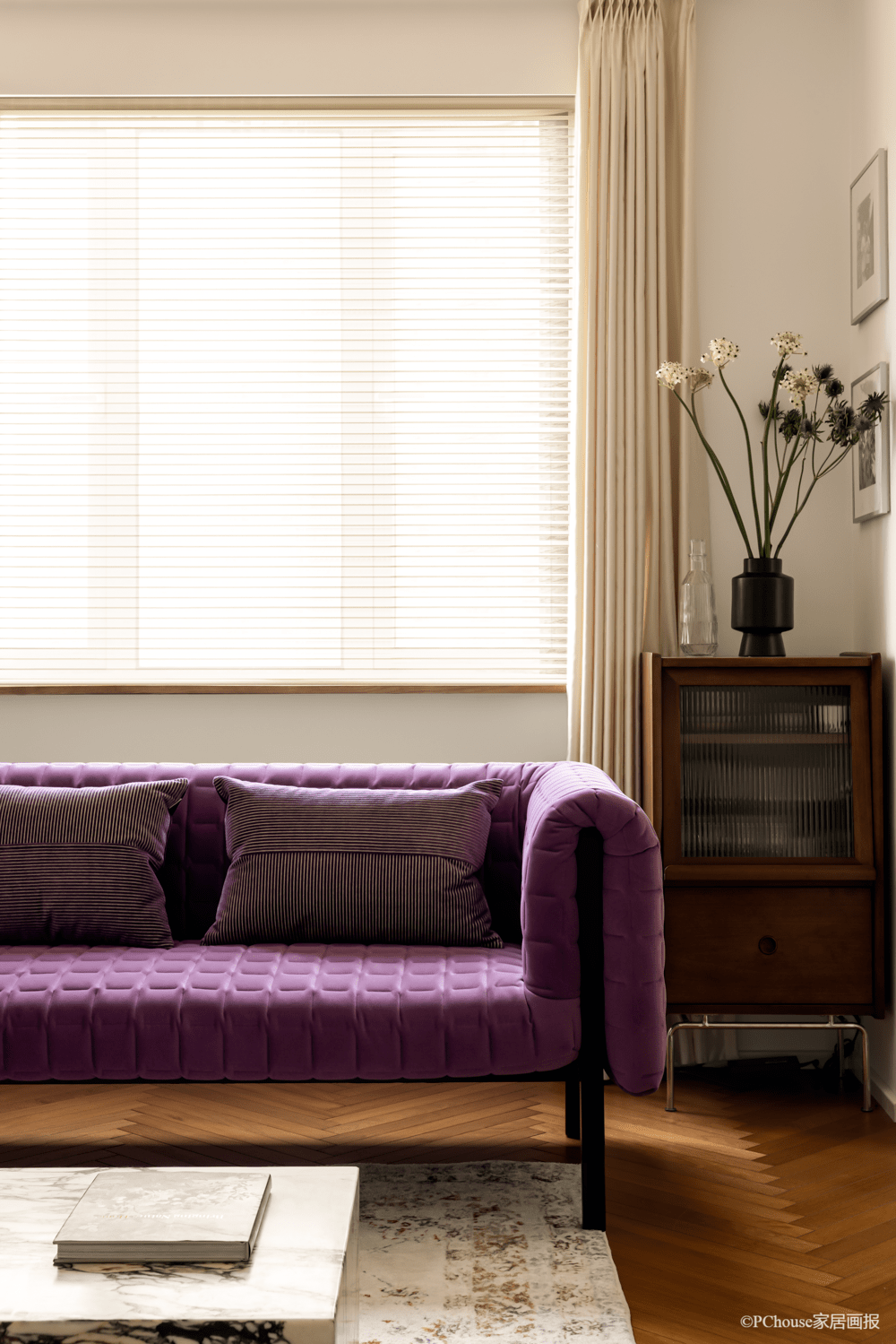▲边柜:muu home 胡桃木小边柜对称摆放在沙发背景墙两侧,窗帘以及百叶帘均选择温和的奶白色,消散高尚气息中的距离感,家的氛围愈加温馨惬意。