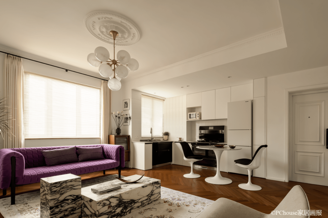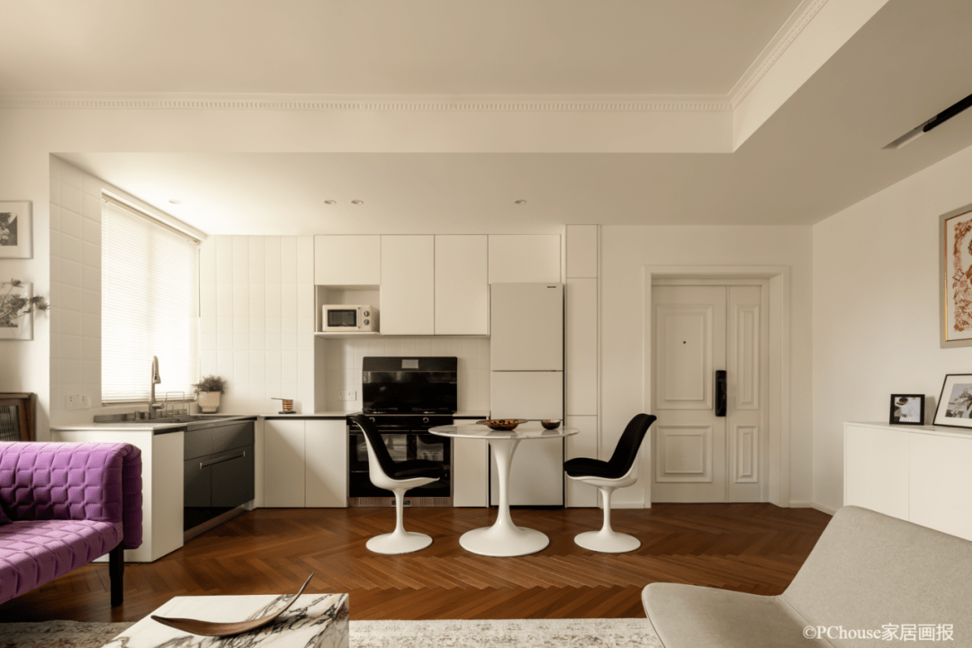 Ldk一体化规划,85㎡的小户型也能具有大平层既视感,屋主一家三口基本不用在家下厨吃饭,于是设计师大胆采用了开放式厨房,极大的扩展了公区面积,也让法味愈加地道。