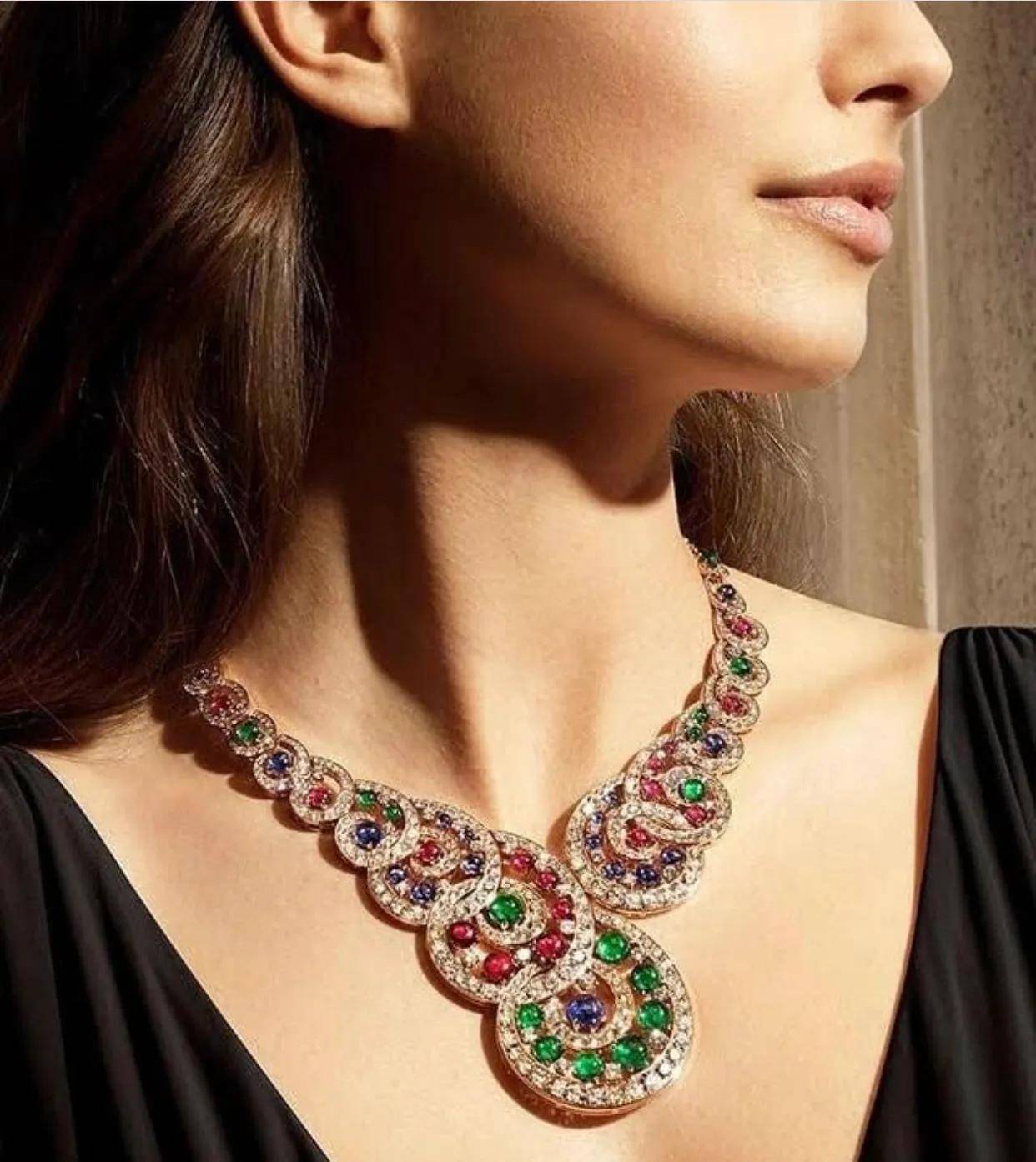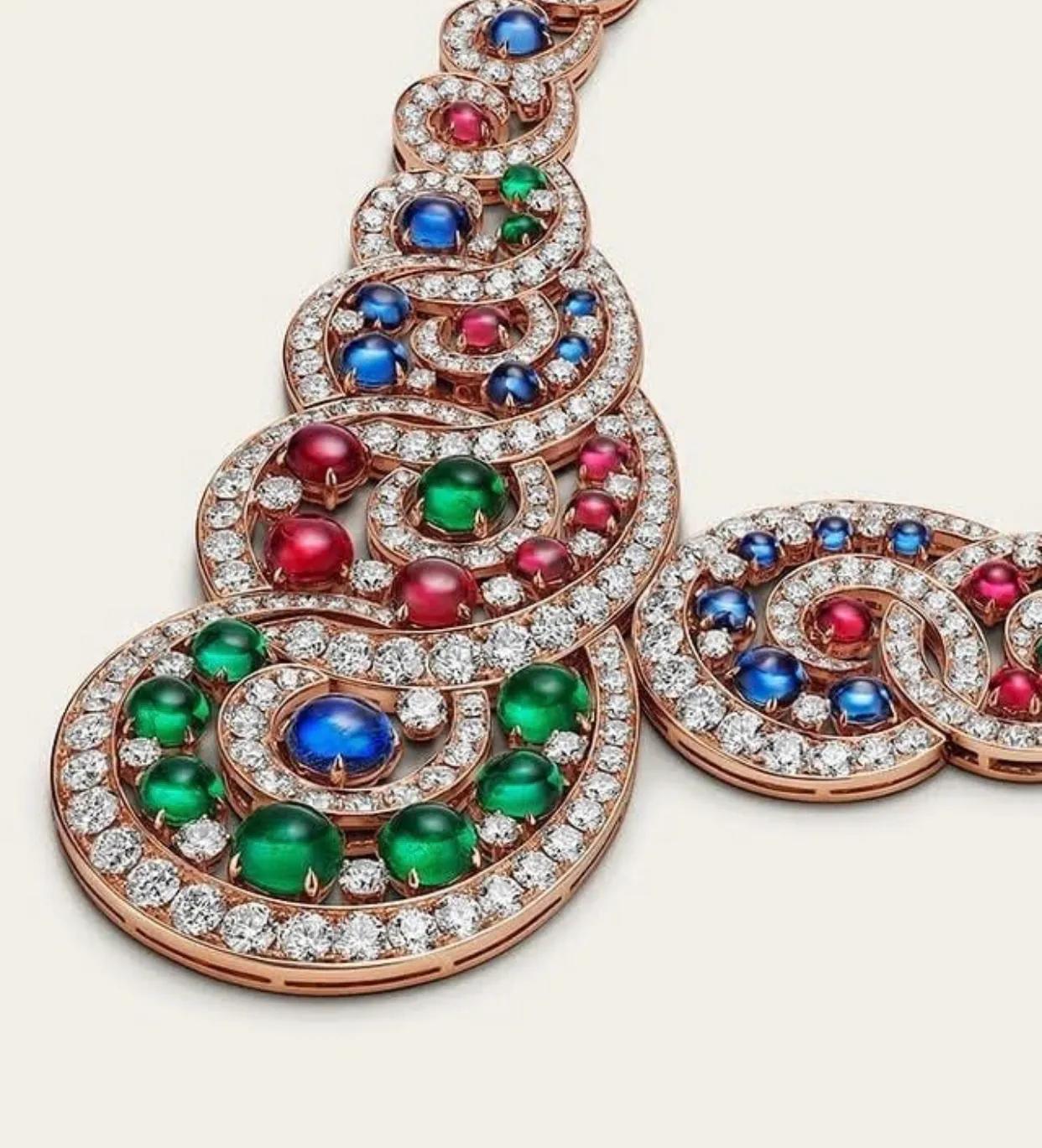 它的颜色搭配是如此的诱人,“巴洛克螺旋项链”是由祖母绿、红宝石、蓝宝石以及顶级钻石制造。