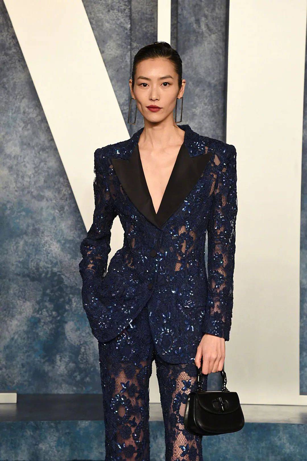 2. 刘雯 刘雯参与 Vanity Fair 名利场奥斯卡派对,穿 Gucci 深蓝色亮片蕾丝西装,搭配大背头和金属耳环,超模气场全开,帅气又性感。