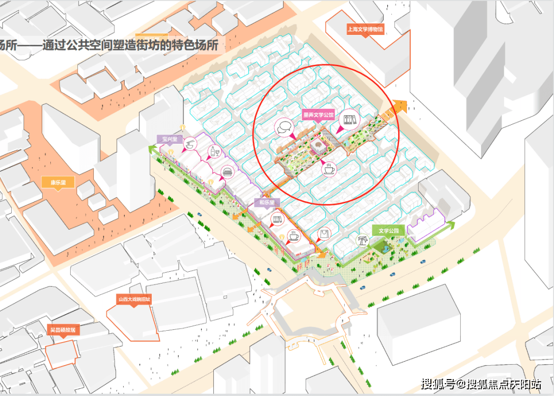 举个例子,公共市集: 毗连西侧健康苑历史风貌商业街,打造对市民开放的现代公共市集,与南北侧街角公园和城市绿化带连动,营造繁华的城市氛围。