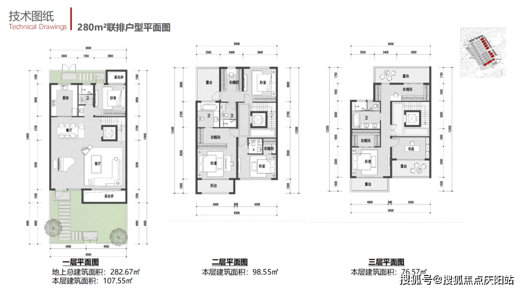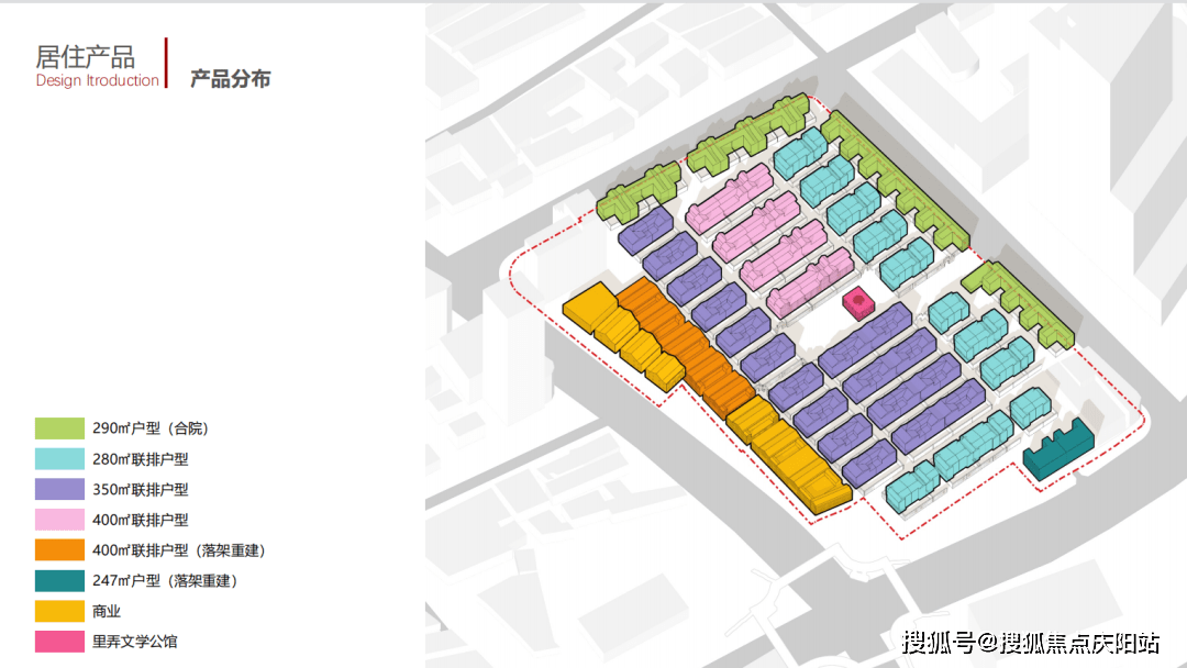 依照计划,一共124套别墅,含15套历史建筑复建住宅。 物业类型应该都是联排,面积为240-280-320-360-420㎡。