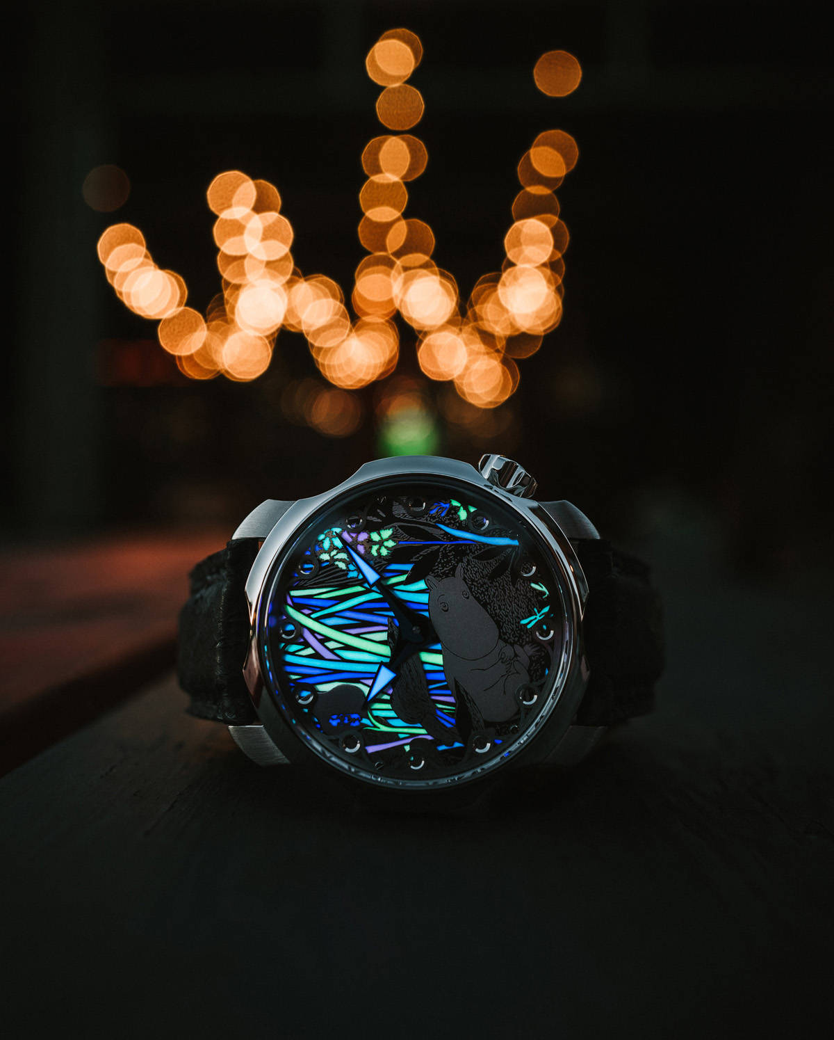 这个新系列的Sarpaneva x Moomin时计是独立制表商的最新作品之一。姆明系列是瑞典-芬兰插画家和作家托芙·杨松 (Tove Jansson) 系列书籍和连环画中的主要人物。该系列手表还有一个亮点,即是用多色SuperLuminova的表盘。如上图所示,呈现出来的夜光图值得每个表友点赞。