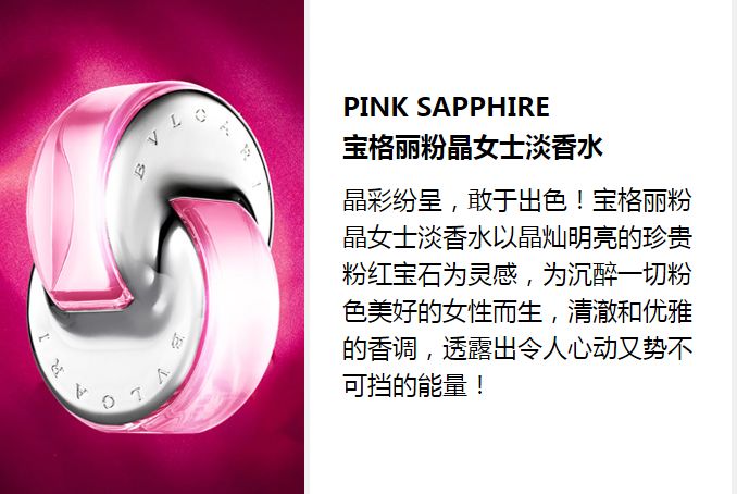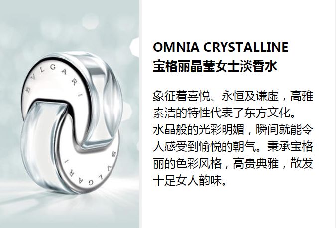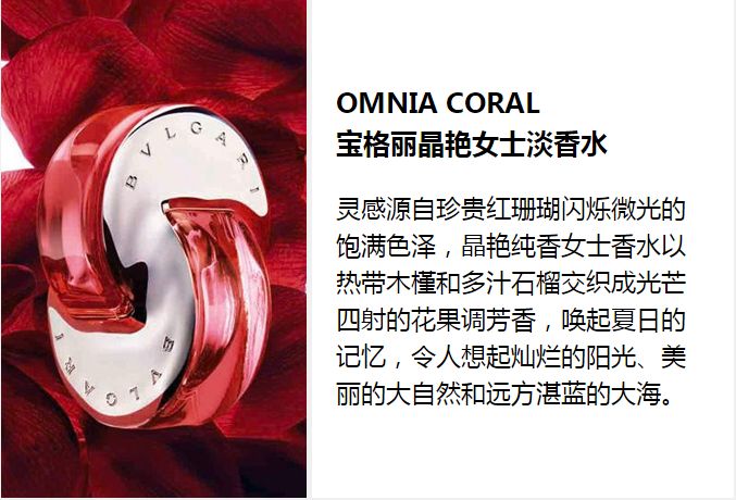 晶彩限量 悦享欢愉 宝格丽晶彩限量系列捕获了诱人糖果的欢愉喜悦与甘美热情,提供多支香氛单品让您选择并欢享!BVLGARI Omnia Crystalline宝格丽晶莹女士淡香水香调清雅怡人,透过群居网的光辉恣意绽放;BVLGARI Omnia Coral宝格丽晶艳女士淡香水融合自然丰沛的花果香,展示红珊瑚宝石的光彩与生机;BVLGARI Omnia Pink Sapphire宝格丽粉晶女士淡香水源于晶灿明亮的粉红宝石,如精彩纷呈的人生体验般弥足可贵;BVLGARI Omnia Améthyste宝格丽紫晶女士淡香水以顶风摇曳的玫瑰和鸢尾花,糅合文雅诱惑的紫群居网,演绎朝露点点的意式花园。