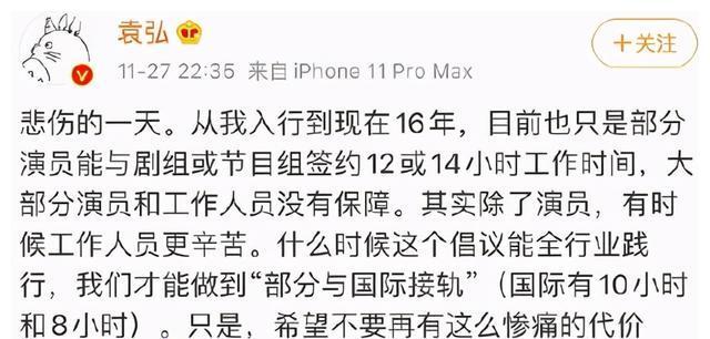 几年前,袁弘同样在社交平台上 埋怨 过,他埋怨的是工作时间。 袁弘呼吁,国内演员的工作时间要和“国际接轨”,他称国际上有10小时和8小时的。