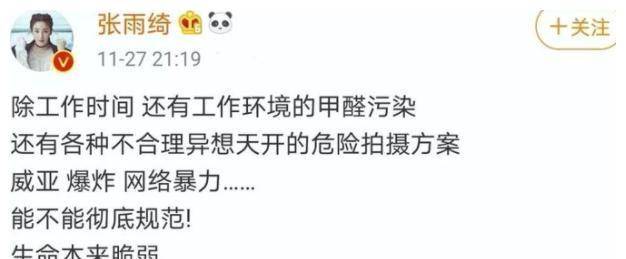 除了工作时间,工作环境还有甲醛污染 ;家具厂、装修工、胶厂的工人们笑了。 各种分歧理想入非非的风险拍摄计划:威亚、爆炸 ;言外之意是,演员不应该吊威亚,明星拍戏不应该有爆炸局面。 网络暴力 ;难道大家都应该宠着明星?为什么很多明星没有这方面的搅扰? 最后,张雨绮给出了总结, 生命原本脆弱,不允许一次次用来证明! 想避免这些所谓的“风险”,其实有计划——转行。 为什么她没有转行呢?