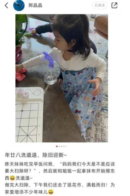 从大女儿开端,郭晶晶就教导女儿自己入手劳动。 逢年过节,都是两个女儿和大人一同收拾家。