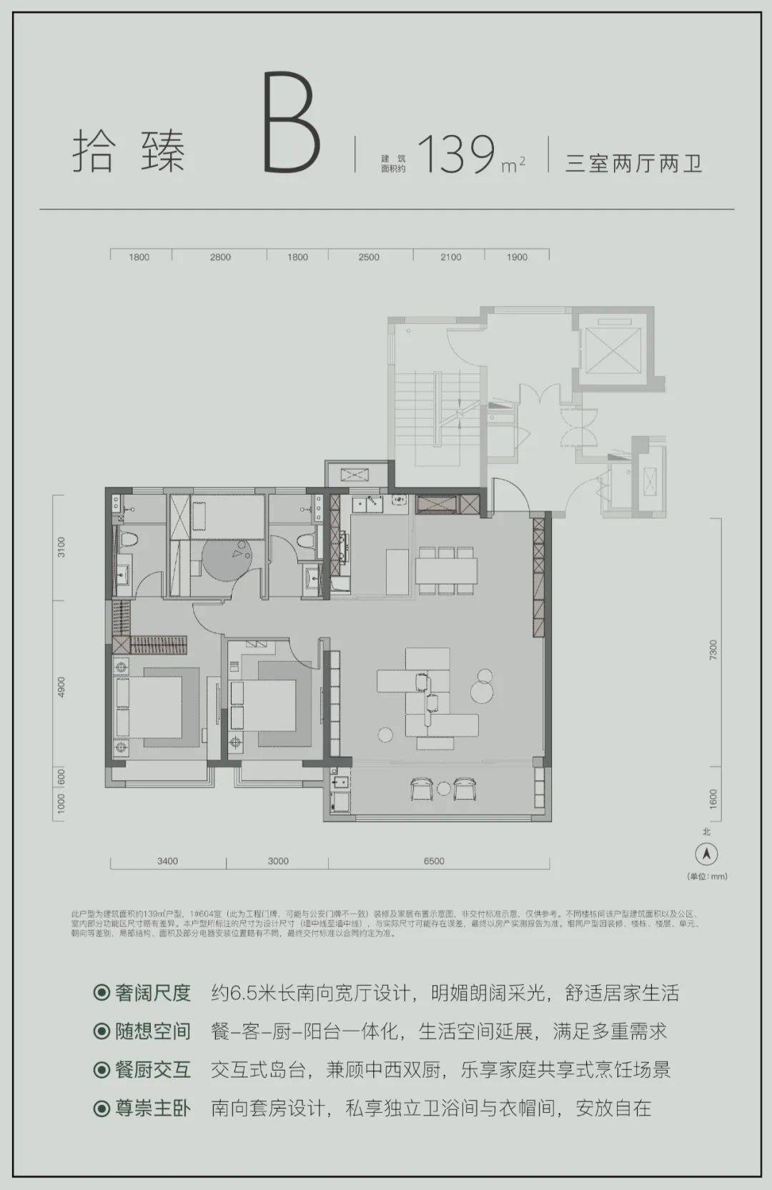 打造约5米的宽厅设计,视野更开阔;客厅及两间卧室均朝南向,附带飘窗;客厅、餐厅、厨房构成开敞通透的LDK一体化空间;主卧配备衣帽间以及独立卫浴,提升寓居体验! 项目建面约139㎡3室2厅2卫户型
