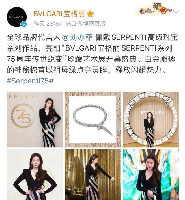 昨日,刘亦菲佩戴SERPENTI系列高级珠宝现身宝格丽活动。宝格丽内外网站宣布刘亦菲成为品牌全球代言人。祝贺茜茜曾五次担任全球代言人。