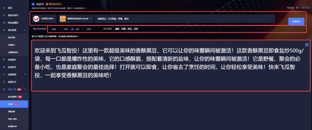 1.塑造产品价值的话术到底怎样说?提升产品卖点: 来一切直播间的法宝们,我这款某醋某酸的的西服外套,我给你们做的全部都是桑丝缎的内里,什么才干给你们做桑丝缎内里?只需专柜当中一两千米的质量才干给你们做出这样的材质。 成本拆解: 来一切直播间的法宝们,我做这个西服外套某醋某酸的面料,我拿一米的成本价钱是78米的成本,宝宝们,我做整个的一个西服外套,需求五米的一个资料,法宝,你们自己算一下是不是大几百的成本价钱, 场景营造: 我跟你们讲,宝宝们就这款西服外套,你们直接给我我穿进来炸街,知道吗?去拍照去凹外型都行,那些30左右岁的一个知性女性的小姐姐们,直接衣着这个衣服,就是你带着你老公,你老公带着钱去那种某专柜当中,某爱马仕的那个专柜的柜姐都拉着你进的那种觉得,十分高端文雅。 福利力度 来一切直播间的宝宝们这么高端的一个西服外套,这么高质量高成本的东西,我今天直接 给大家一个。这个衬衫价钱不到,你们今天拍到,我再送一条吊带连衣裙。 总结: 提升产品卖点+成本拆解+场景营造+福利力度,产品卖点上面有导图能够看,4个方向点是可 以自由组合的,就看你如何让玩出新的话术把戏了~ 这么多话术,但分歧适你直播间,你又不会写话术怎样办!没关系,所以往常曾经有系统基于GPT和飞瓜大数据,帮运营团队自动生成最新的高转化高互动话术模版。