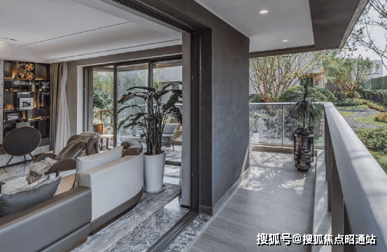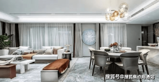 259㎡户型模范间 步入客厅,整个厅面的空中材质是来自摩洛哥进口石材——卡瑟灰。 电视背景墙是青花白自然大理石,纹理如画,质量感极强。 看似都是大理石,但是依据每个空间的功用不同选择不同纹理、材质的大理石,各具特征又保障整体调和统一。 空间规划上,259㎡户型采用豪宅大平层偏爱的边厅设计。 端厅的特征是具有270°及以上采光面,由于高度迎合当下壕宅消费群体对公区空间和视野景观的极致追求而盛行。