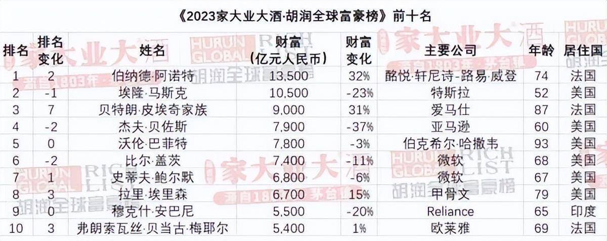 3月23日,胡润研讨院在上海发布《2023胡润全球富豪榜》。榜单显现,今年共有69个国度、2356家公司的3112位十亿美金企业家上榜。与去年相比,十亿美金企业家的数量减少了8%,他们的总财富降落了10%。 进入世界前十名的门槛,从十年前的1900亿元人民币增加到五年前的3100亿元人民币,今年则为5400亿元人民币。 “朴素品之王”阿诺特初次登顶,马斯克退居第二 “朴素品之王”、LVMH 74岁的伯纳德·阿诺特财富增加3300亿元,以1.35万亿元人民币初次成为世界首富。
