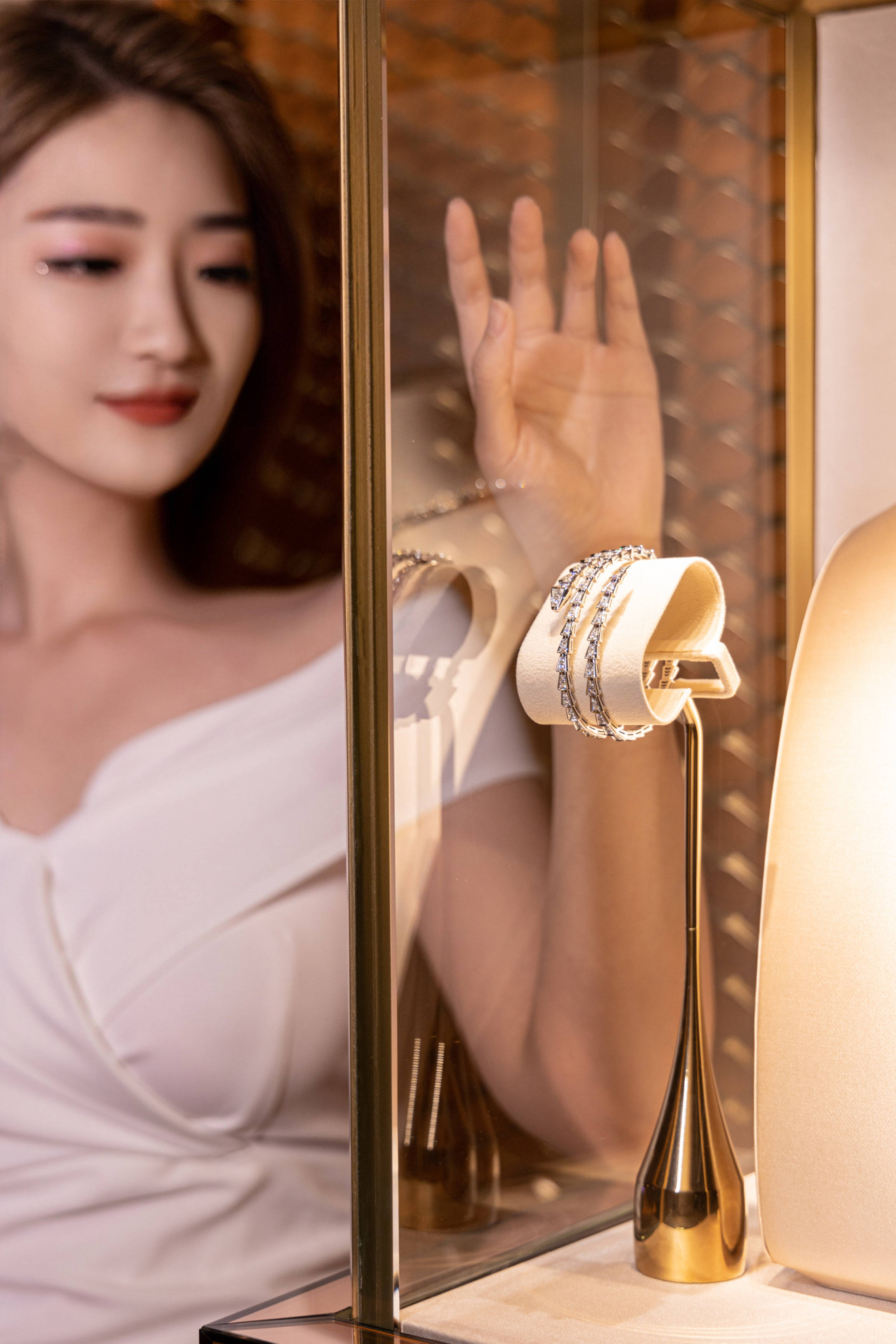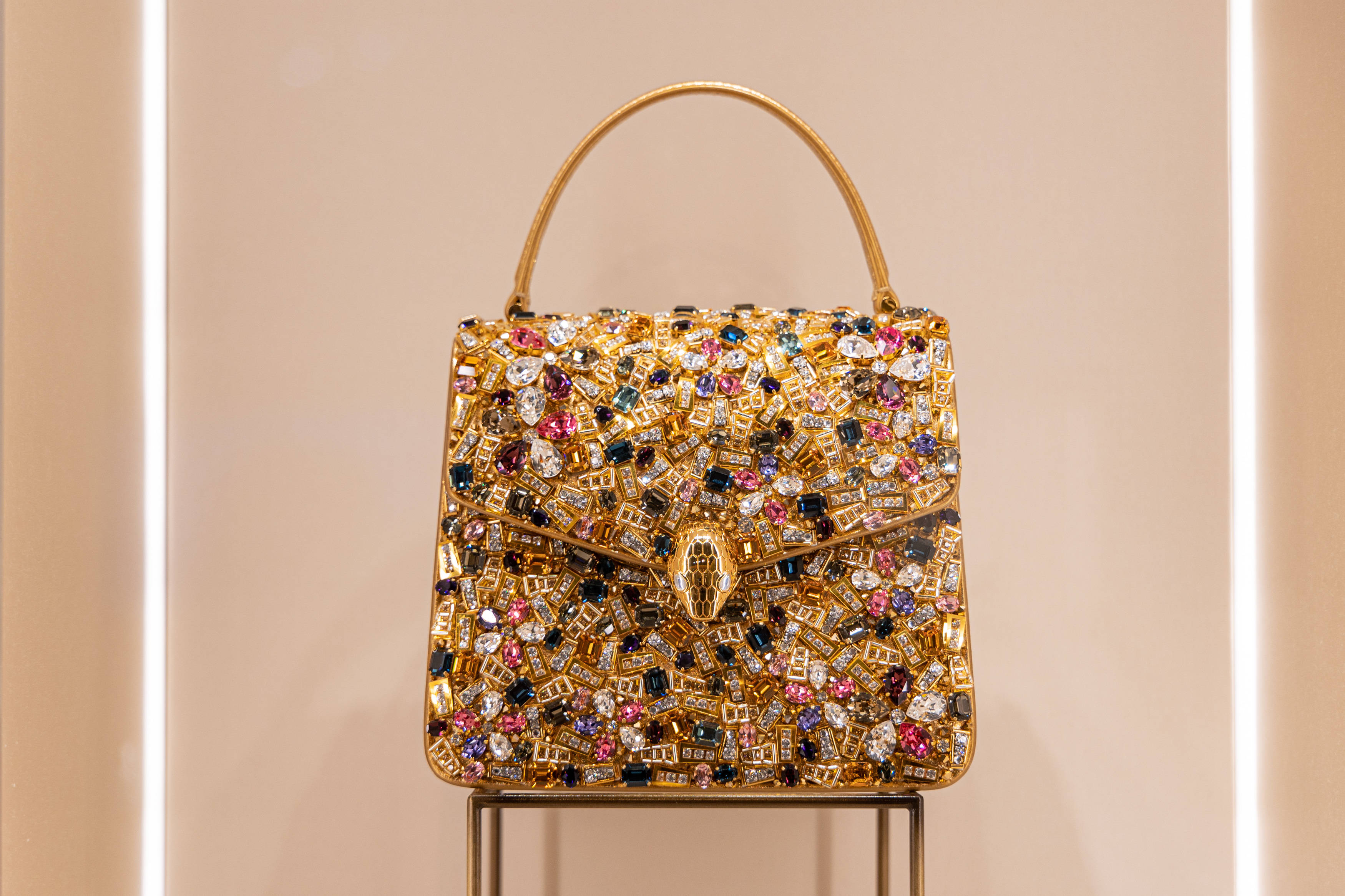 展示柜琳琅陈列宝格丽 SERPENTI系列珠宝包袋 刘亦菲同款蓝宝石美得不相上下 以光辉勾勒婉曼美貌