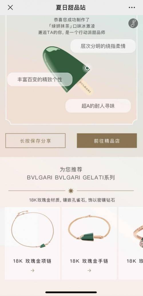 作为众所周知的朴素品品牌,宝格丽紧跟互联网展开步伐,早在2000年底,宝格丽就开设了旗下首家线上精品店,是最早规划电商范畴的朴素品牌之一。往常宝格丽已在美国、加拿大、中国、日本、英国、德国、西班牙和澳大利亚八个主要国度完成电商平台的规划。 随着消费对移动互联网依赖度不时增加,品牌主对线上营销和运营越发注重,这也使得互联网平台在承担品牌线上销售的同时成为了品牌营销的重要载体。因而,在全民购物线上化的大背景下,有着丰厚电商阅历的宝格丽也在寻求营销多元化的突破,积极探求线上线下营销的深度融合,并借此突破外界对宝格丽“成熟文雅”的固有印象,完成消费群体的扩展。而百度智能小程序“超级APP+小程序”的生态属性则恰恰满足了宝格丽营销需求。一方面,消费者在置办商品之前,常常会上百度搜索一下品牌信息、商品评价或看看测评内容,而百度智能小程序则能够作为直接购物入口,大大降低了消费者从了解商品到消费的操作成本。 此次百度智能小程序与宝格丽的协作,也是一次线上丰厚品牌精准受众的重要尝试。随着个性化盛行趋向的盛行,充溢个性的胸针又重新俘获时兴界的眼光,成为时兴人士的宠儿。而宝格丽此次推出的夏日冰激凌系列则吸取了2016年推出的Roman Sorbets罗马雪芭系列的灵感,诠氏缢罗马炎炎夏日中那单纯而又令人耐人寻味的舌尖飨宴。明艳的宝石宛若色泽丰沛的意式雪芭,一丝清凉带给人“到清凉境,生欢欣心”的甘美时辰,对年轻人有极大吸收力。 此外,推出的“夏日甜品站”游戏,则将冰激凌系列的特性以兴味化游戏的方式向消费者展示出来,在强化年轻消费者参与感的同时也提升了置办动力。用户经过体验百度智能小程序和宝格丽分离打造的“夏日甜品站”游戏,不只能够取得属于自己的夏日冰激凌,还能够取得专属订单密钥。在唤起用户在夏日对冰激凌的渴求时,小程序也会依据用户的游戏结果,引荐相对应的珠宝产品。同时还可直接点击界面下方的前往精品店中止更多产品的了解与选购。简单来说,这一段小游戏体验,不只能够激起用户兴味参与互动,还能够有效向小程序引流。