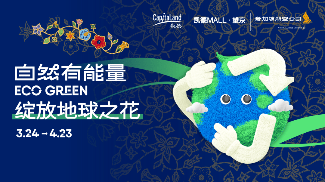 分离凯德2023“自然有能量Eco Green”主题活动,新航将其标记性蜡染印花元素渲染至该主题之下引入的“球仔”角色,打造了一处奄奄一息的消费者互动装置。活动现场设置塑料瓶回收区,消费者在完成回收的同时,能够将瓶盖依据颜色分别粘贴在新航蜡染印花的不同花卉区域,从而为作品“上色”,完成艺术共创,绽放地球之花。花卉的绽放意味着地球的生命力,充溢南洋风情的蜡染印花由新加坡本地的10种花卉组合而成,展示新航独有的文雅与热情,也传送出新航珍爱自然、努力于与自然调和共生的可持续展开理念。