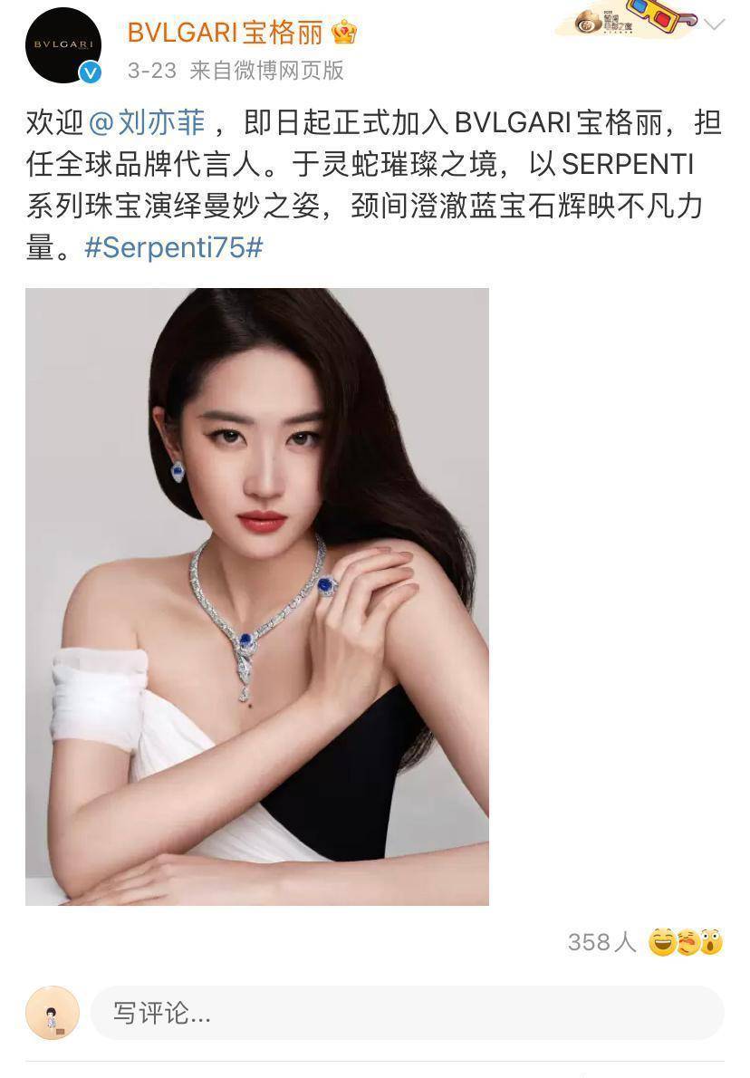 除了刘亦菲,这个wb之夜的最大赢家是刘亦菲身后的宝格丽; 3月23日wb之夜前夕,宝格丽忽然宣布刘亦菲为全球品牌代言人;