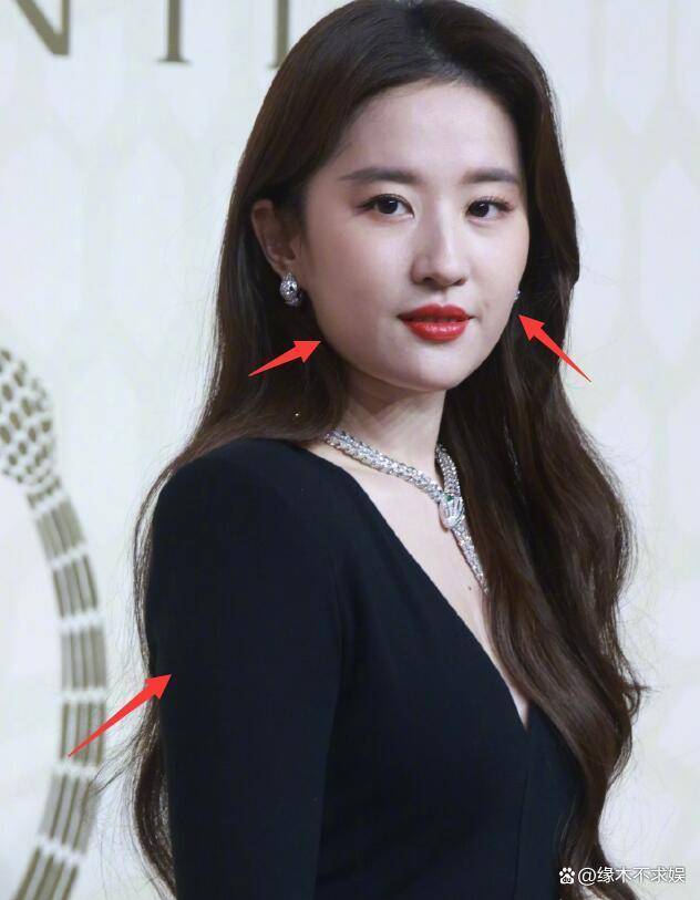 刘亦菲当天身穿黑色拼接V领连衣裙,看上去中规中矩。生图下,她的胳膊略粗,两颊也隐隐有发腮的迹象,但皮肤润滑无瑕疵,状态尚算不错 。