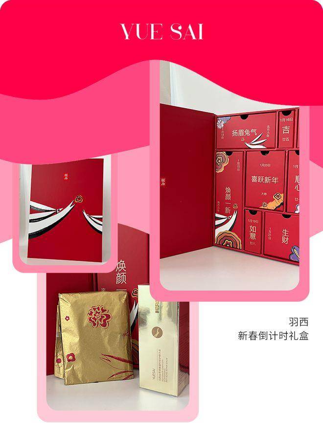 喜跃新年,跃起新礼,羽西的红色礼盒上腾跃着的兔子可不简单,这是青年艺术家lulu与羽西携手,以坚柔并济的灵动兔跃,表白着英勇腾跃的向上姿势~ 翻开礼盒,是羽西在此跃进新年之际,为大家呈现出2023「新春倒计时礼盒」,每个日期上都表白着羽西对大家的新年祝福,将全新灵芝水乳cp与鎏金家族系列藏匿于盲盒之中,这种拆盲盒的觉得应该没有谁会不喜欢吧。